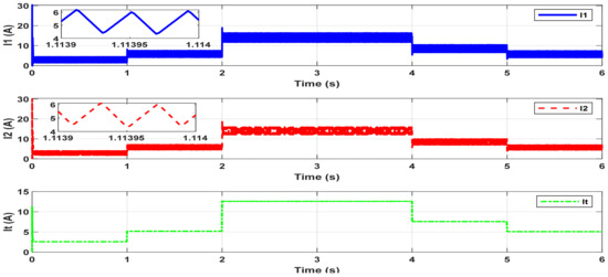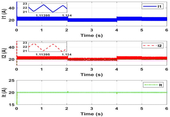 Figure 11 presents the current waveforms of the IBC under step changes in the CPL. The top and middle subplots show the inductor currents I1 (blue, solid) and I2 (red, dashed), respectively, while the bottom subplot displays the total output current It (green, dash-dotted), computed as the phasor sum of I1 and I2, which are designed to be 180° out of phase. At each transition point (t = 1 s, 2 s, 4 s, and 5 s), corresponding to changes in CPL power, I1 and I2 exhibit stepwise adjustments, maintaining symmetrical ripple profiles, as shown in the zoomed insets. These insets reveal the high-frequency triangular ripple resulting from interleaving operation. Notably, the control strategy maintains balanced current sharing between the phases throughout all operating conditions, with both I1 and I2 adapting consistently to the total current demand. The total output current It tracks the CPL load dynamics with high fidelity, increasing or decreasing in response to step changes in power demand. This behavior confirms that the system effectively distributes the current between converter phases while preserving overall current accuracy, dynamic responsiveness, and system stability.