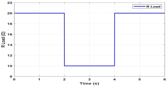 Figure 12, Figure 13 and Figure 14 evaluate the performance of the proposed control scheme under variations in a constant voltage load (CVL). In this scenario, the load resistance is reduced to 50% of its nominal value at t = 2 s and is restored to 20 Ω at t = 4 s, as illustrated in Figure 12. Figure 13 illustrates the dynamic behavior of the DC bus voltage in response to abrupt changes in the CVL. At t = 2 s, the load resistance is decreased to 10 Ω and subsequently restored to 20 Ω at t = 4 s. These load perturbations induce noticeable but brief transients in the bus voltage. As shown in the zoomed inset, a sharp deviation occurs at each transition point; however, the voltage promptly re-stabilizes to the reference value, confirming the effectiveness of the proposed control strategy in mitigating voltage disturbances and maintaining regulation. This response highlights the system’s robustness in handling resistive load variations, as well as the controller’s ability to reject disturbances and restore steady-state conditions within a short time frame. The minimal overshoot and fast settling time underscore the high-performance nature of the voltage regulation loop under varying CVL conditions.