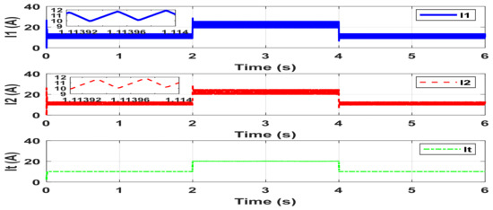 Figure 14 illustrates the time-domain waveforms of the individual inductor currents (I1 and I2) and the total output current in the two-phase IBC, emphasizing the system’s dynamic performance and current-sharing effectiveness. The converter is subjected to two step changes in load: the total output current increases from approximately 11 A to 22 A at t = 2 s and subsequently decreases back to 11 A at t = 4 s. Throughout these transitions, the control scheme maintains balanced current distribution, with I1 and I2 each supplying nearly half of the total load current. The magnified insets highlight the high-frequency triangular ripple characteristic of switched-mode converters and demonstrate the 180° phase shift between I1 and I2. This interleaved operation results in partial ripple cancellation at the output, yielding a smoother total current waveform. This behavior underscores a key benefit of interleaving: improved output current quality with reduced ripple, which translates to relaxed filtering requirements and enhanced system efficiency.