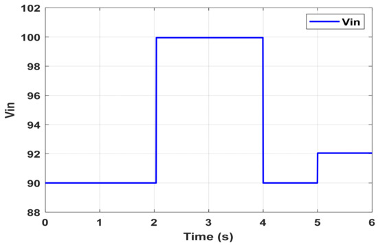 Figure 15, Figure 16 and Figure 17 evaluate the robustness of the proposed control strategy under fluctuations in the input voltage supplied to the converters. This case simulates a realistic scenario in which the input voltage experiences multiple step changes: it increases from 90 V to 100 V, then decreases to 90 V, and finally settles at 92 V. These variations are depicted in Figure 15.