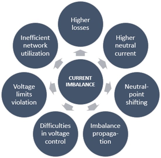 Current and voltage imbalances are interconnected and should not be addressed separately. Voltage imbalances can cause current imbalances, resulting in financial and technical losses for both end-users and distribution network operators. Figure 1 illustrates how current imbalances lead to technical issues in the LVDNs of the DNOs. It emphasizes the challenges in voltage control, the management of the distribution process associated with the increasing energy efficiency, as well as the risk that this imbalance could propagate throughout the MV distribution networks [,].