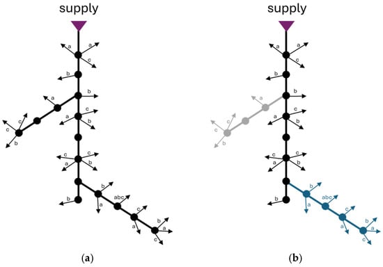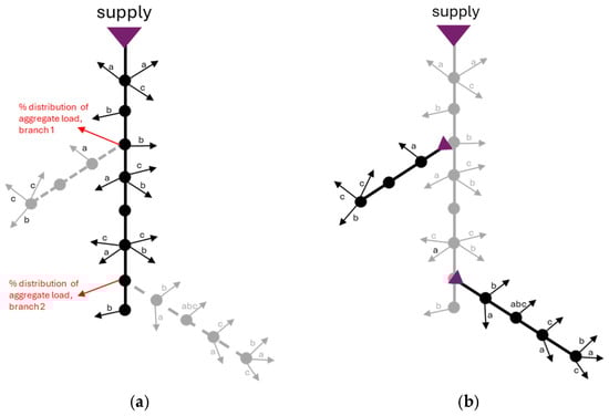 The approach considers first each branch as a separate network, in which the optimization is performed with the objective of minimizing losses, resulting in phase reassignment only for the consumers belonging to the respective branch (Figure 5a). As a result, it is expected that the load on the three phases at the beginning of each branch will result in being as balanced as possible, since this is the behavior observed when the entire network is optimized (balanced phase loads on feeders with the highest loads leads to minimal energy losses).