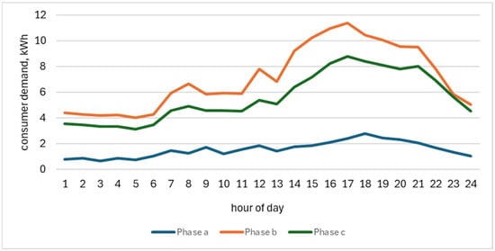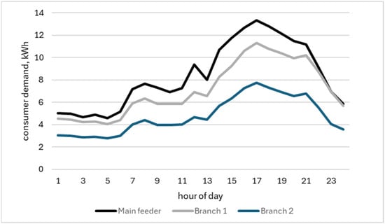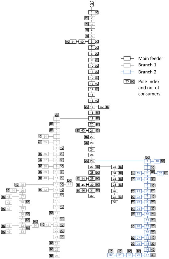 As described above, low-voltage distribution networks usually supply many one-phase consumers and a small number of larger, three-phase consumers, through three-phase, four-wire feeders in a tree-like structure. Each consumer is connected to its supply point through an individual connection, according to its type (one- or three-phase). In rural or suburban areas, these networks are usually aerial, with consumers connected at poles. In urban areas, underground cables are used, and individual consumers are connected to the grid through distribution boxes. The length of the network and the number of consumers connected to each pole or box change over time as the network develops over months or years of operation. The demand of each consumer is variable during the day, according to its needs and preferences. A basic diagram of such a network is presented in Figure 2a.