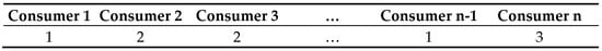 The structure of a solution optimized by the PSO solution was chosen to encode in a straightforward manner the distribution of the consumers on the phases. The principle from Figure 4 is used. The length of the solution vector is equal to the number of consumers from the network, and each element has the value 1, 2, 3, or 0, denoting the phase of connection (1–3) or a three-phase consumer (0). This approach prevents the shifting of consumers between poles and allows only changing the phase of connection for each individual consumer. In this way, constraints (4) and (5) are always fulfilled. The fulfillment of constraint (6) is a consequence of finding the phase load distribution with minimal losses, which is one where the phase loads are balanced.
