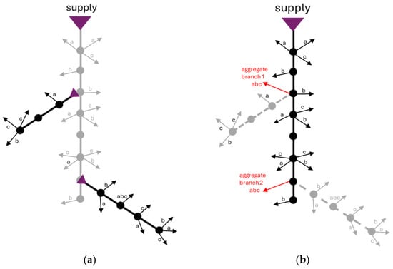 In the last stage of the algorithm, the phase balancing is performed on the main feeder, where the branches are considered as aggregate phase loads of all consumers from the respective branch plus losses (Figure 5b). A branch is thus modeled as a single, possibly unbalanced three-phase consumer. In this way, the optimization is performed using the same principle as in [,].