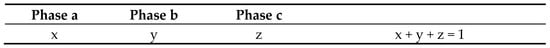 where is the power losses in the phase conductors ph, with ph {a,b,c}, from section s, where s = 1, …, S, and S represents the total number of the sections forming the LVDN at hour h, where h = 1, …, H; is the hourly power losses in the neutral conductor from branch s and at hour h; is the current in the phase conductor ph at hour h; nph is the total number of the phases (generally, nph = 3); and H is the analysis period.