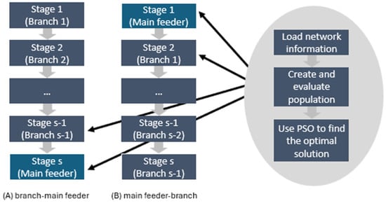 A comparative flowchart of the two multistage methods is presented in Figure 8. The number of stages, denoted with s, is network- and user-dependent, with s-1 stages for the branches and 1 stage for the main feeder. Each stage uses the PSO algorithm to find the optimal phase distribution of consumers. The branch optimization stages can be executed in parallel. The fitness function requires a load-flow computation that determines the losses in the network, using a direct three-phase load-flow algorithm as described in [,] that uses graph theory and the branch current imbalance factor (CIF) from Equation (7). The time interval of the analysis is scalable by the user. In accordance with the available data, in this paper H = 24 samples (hours).