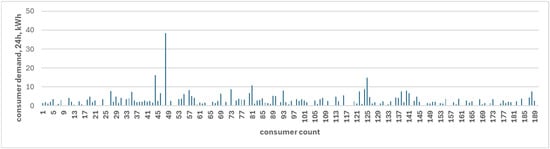 The two multistage methods described above were tested using a real LVDN from northern Romania, which supplies 190 one-phase residential consumers in a rural area. The LVDN was divided into one main feeder and two branches (Figure 9, Table 2). Its total active load over a 24 h interval is 486.89 kWh, and with its default consumer-phase allocation the active energy losses amount to 36.149 kWh (6.91%). The branches and the main feeder have comparable demand (Figure 10, Table 2), but the losses on the main feeder (32.64 kWh) are considerably higher than on the branches (2,8 and 0.73 kWh). Consumers have a demand ranging from 0 to 5 kWh, but 28% have a very low demand of under 0.5 kWh per day. Of the 22 consumers that exceed 5 kWh, 4 have a demand of more than 10 kWh, with 1 peaking at 38 kWh (consumer 48 at pole 26 on the main feeder). More details on the consumer distribution according to their demand can be seen in Table 3 and Figure 11.