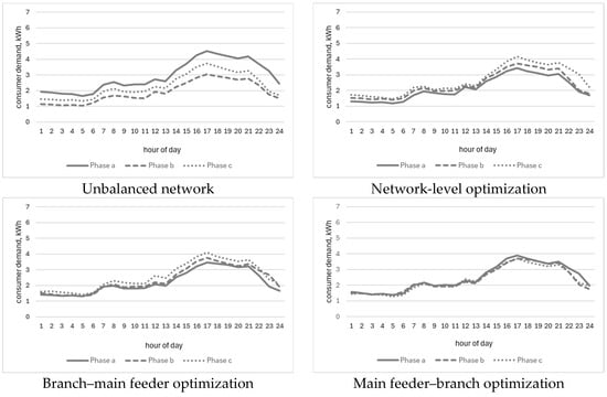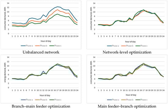 In the subsequent stages (Figure 6b) on each feeder, the percentage distribution of its total load on the phases is considered as objective when choosing the optimal connection phase for each consumer, together with the minimization of losses, which can be represented as follows: