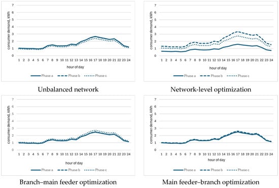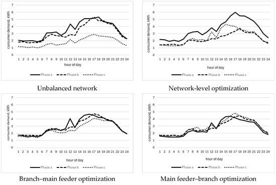 As shown in the results section, especially in Table 4, Table 5 and Table 6, the proposed methods have different outcomes in terms of consumer phase reassignment. From the perspective of loss minimization, the active energy losses are reduced from 36.025 kWh (6.91%) in the unbalanced network to 32.888 kWh (6.33%) in the balanced network when the referenced network-level method is used. This decrease of approximately 0.58% proves the opportunity for load balancing.