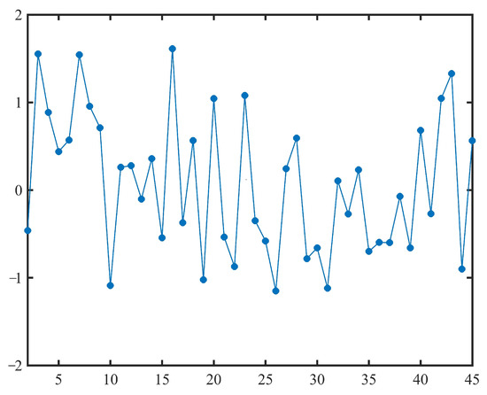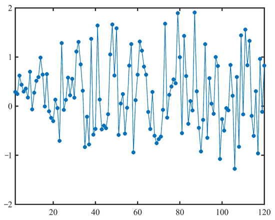 By substituting the estimated and into (20), we can obtain 119 samples of the normal uncertainty distribution , as shown in Table 2 and Figure 1. In order to test whether the estimated time-varying parameters and are appropriate, it follows from the analysis of Example 2 that the test should be