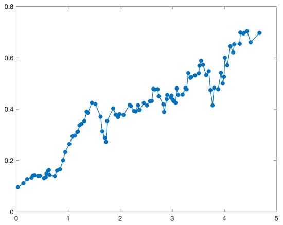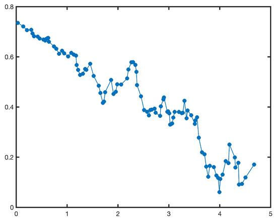 of the solution to uncertain differential Equation (11) at time points with , respectively. By using the method proposed in Section 4, we can also obtain samples of the symmetric statistical invariant , where the time-varying parameter serves as the independent variable. That is,
