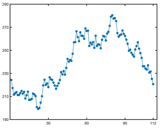 Anhui Gujinggong Liquor Co., Ltd. (Bozhou, China) is the core enterprise of Gujing Group and is the first liquor enterprise in China to issue both A shares and B shares. The stock prices of this company can to some extent reflect the fluctuations of the Chinese liquor market. In order to model the stock prices of Anhui Gujinggong Liquor Co., Ltd. (stock code: 000596.SZ), listed on the Shenzhen Stock Exchange, we collected the closing prices of the company’s stocks for all trading days from 1 January 2024 to 21 June 2024, with the currency unit being RMB. The data were sourced from the official historical trading records of Anhui Gujinggong Liquor Co., Ltd. provided by Sina Finance, which can be accessed via the webpage link (https://finance.sina.com.cn/realstock/company/sz000596/nc.shtml, accessed on 12 September 2025). The data were obtained on 12 September 2025, and a total of 112 valid data samples were obtained. The specific details of the closing prices can be seen in Table 6, while the trend of the closing prices can be seen in Figure 5.