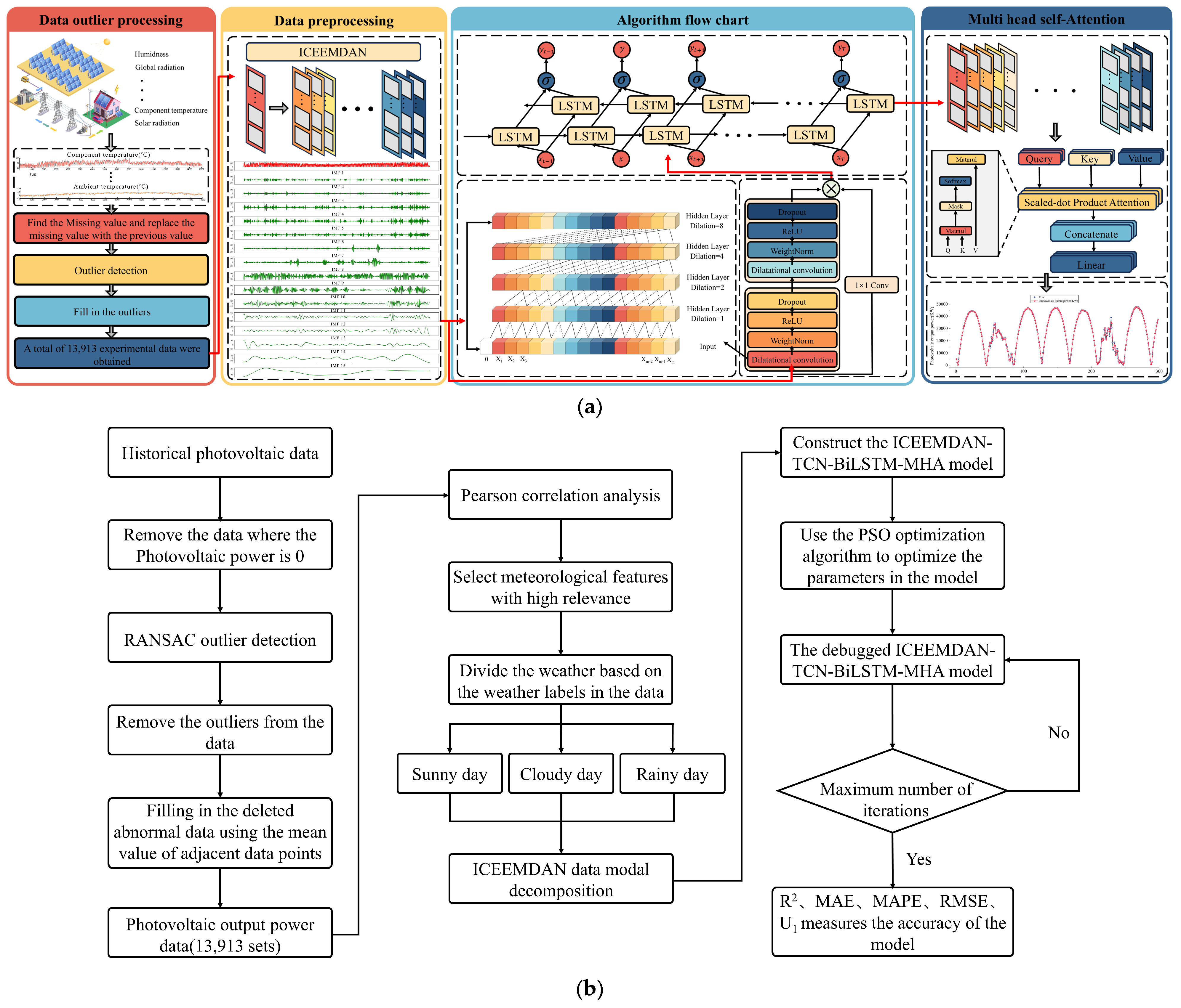 3.1. The Short-Term Prediction Process of Photovoltaic Based on ICEEMDAN-TCN-BiLSTM-MHA
