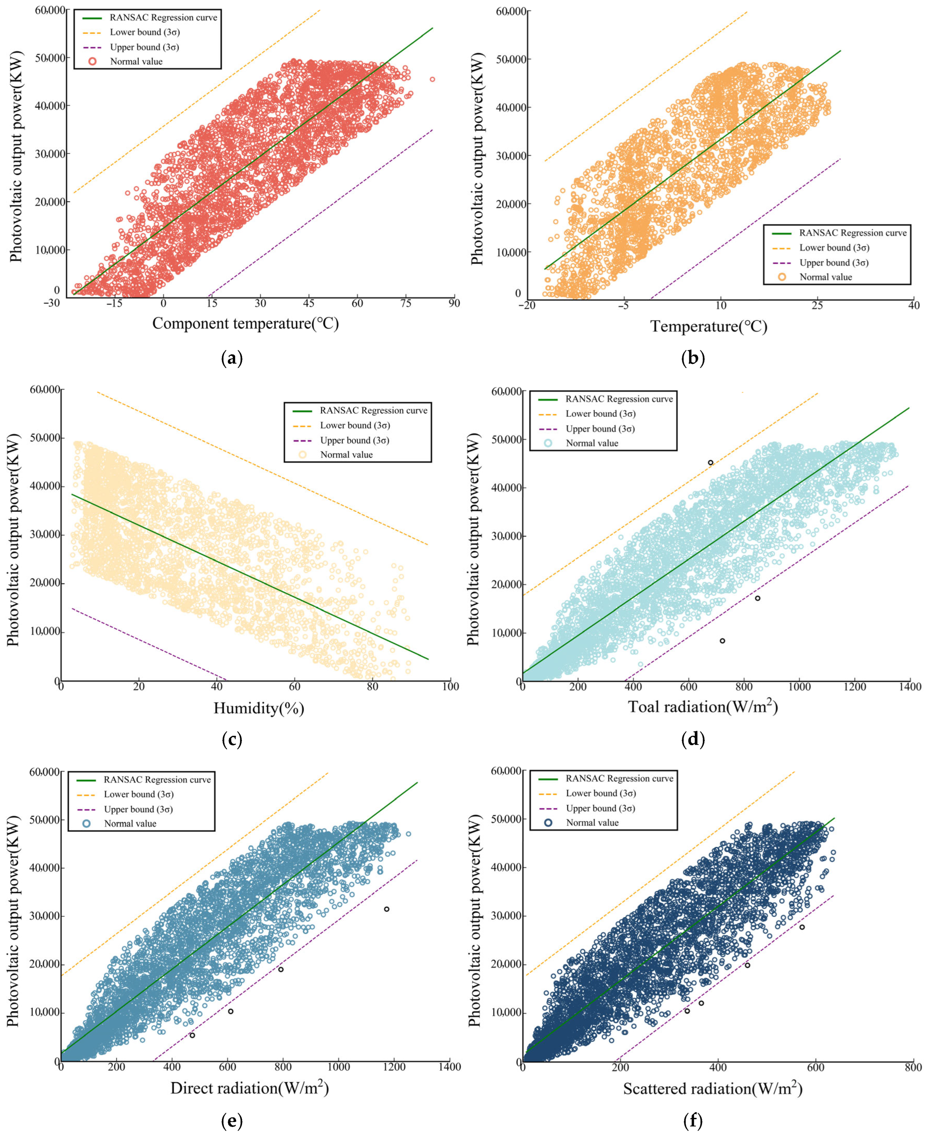 42]. However, during data collection at PV power plants, issues such as signal interruptions caused by extreme weather conditions affecting wireless communication and instrument errors in the data collection system may result in missing or anomalous data in the raw data. To enhance the validity of the data and improve the predictive accuracy of the model, it is necessary to eliminate the interference of unfavorable data on model training. First, 15,671 datasets with constant zero power at night were excluded; then, the remaining 14,042 datasets were subjected to Random Sample Consensus (RANSAC) outlier detection in batches of 5000. The RANSAC regression algorithm identifies outliers by calculating the regression residuals for each data point. If the absolute value of the residual exceeds three times the standard deviation (exceeding 3