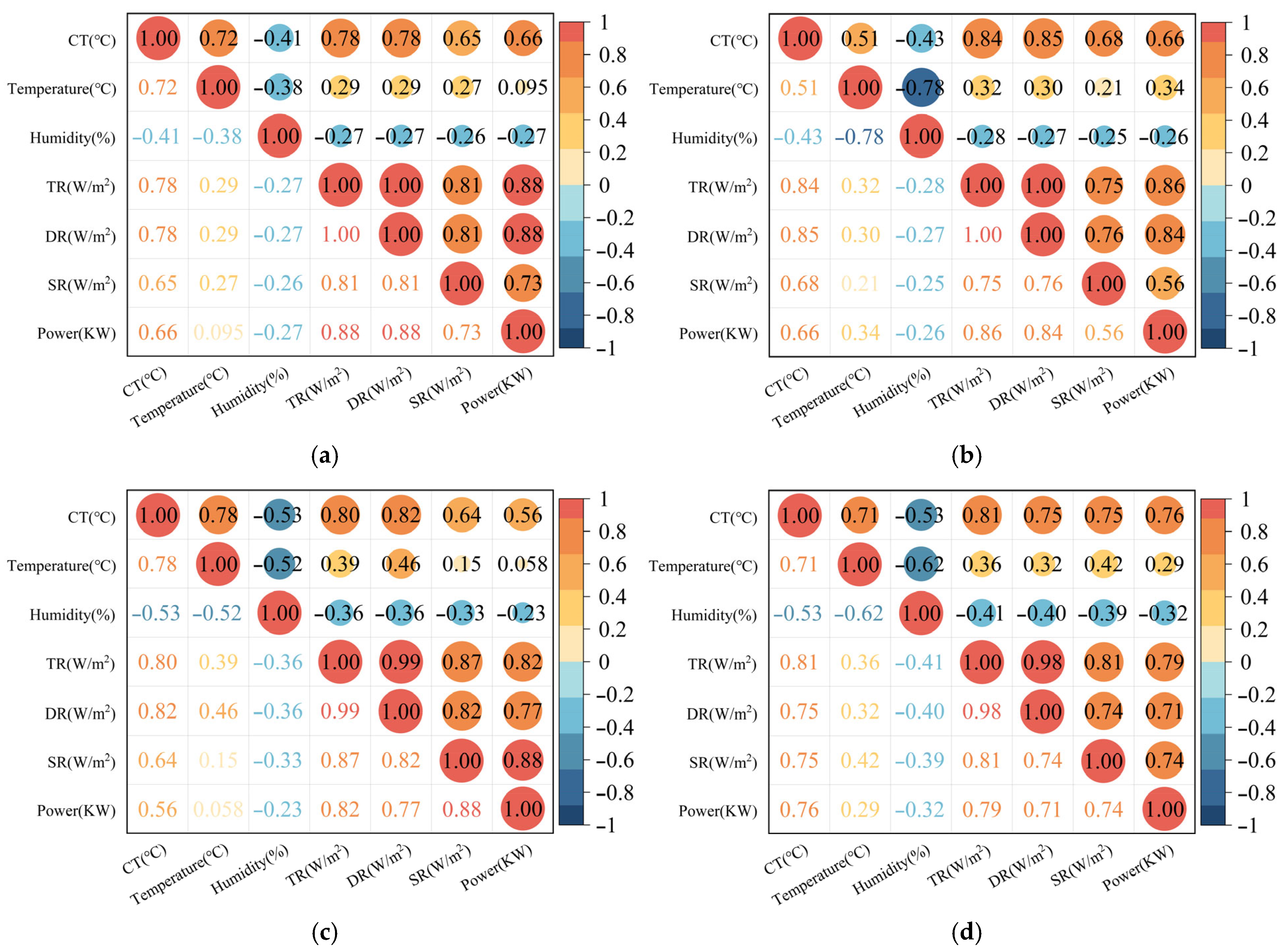 To reduce the complexity of model learning and enhance computational efficiency, while avoiding the negative impact of redundant and irrelevant features on model symmetry, Pearson correlation analysis was used to analyze the correlation between six types of meteorological features affecting PV output power and different seasons, including spring (March to May), summer (June to August), autumn (September to November), and winter (December to February), as shown in