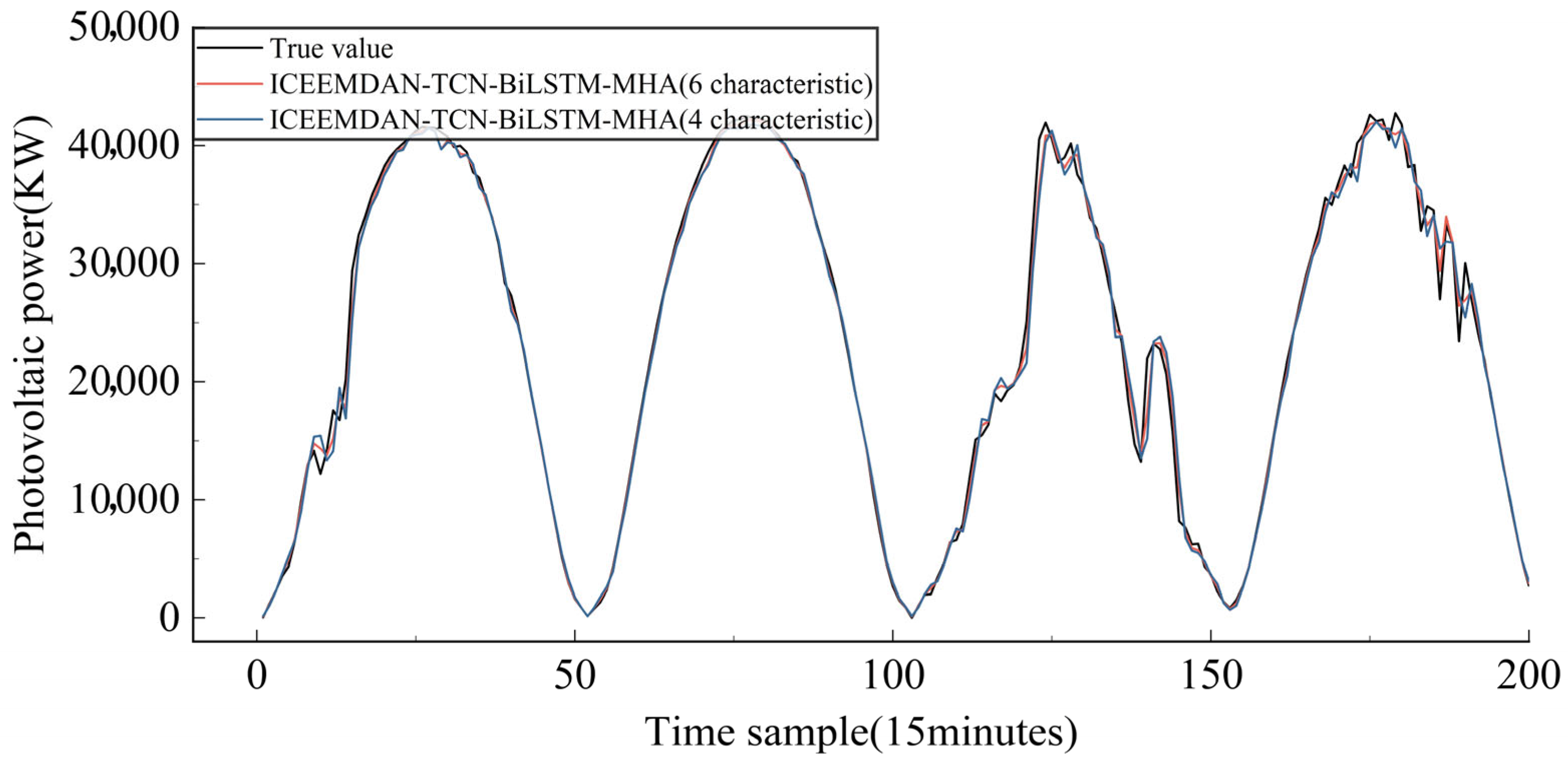 34]. To address these limitations, the proposed ICEEMDAN-TCN-BiLSTM-MHA hybrid model employs ICEEMDAN to effectively suppress non-stationarity in input data, thereby supplying higher-quality components for subsequent forecasting. Furthermore, the integrated TCN-BiLSTM architecture enhanced with multi-head attention mechanism simultaneously improves local feature extraction, long-range dependency modeling, and key information highlighting, leading to enhanced prediction accuracy and stability in challenging scenarios such as extreme weather.