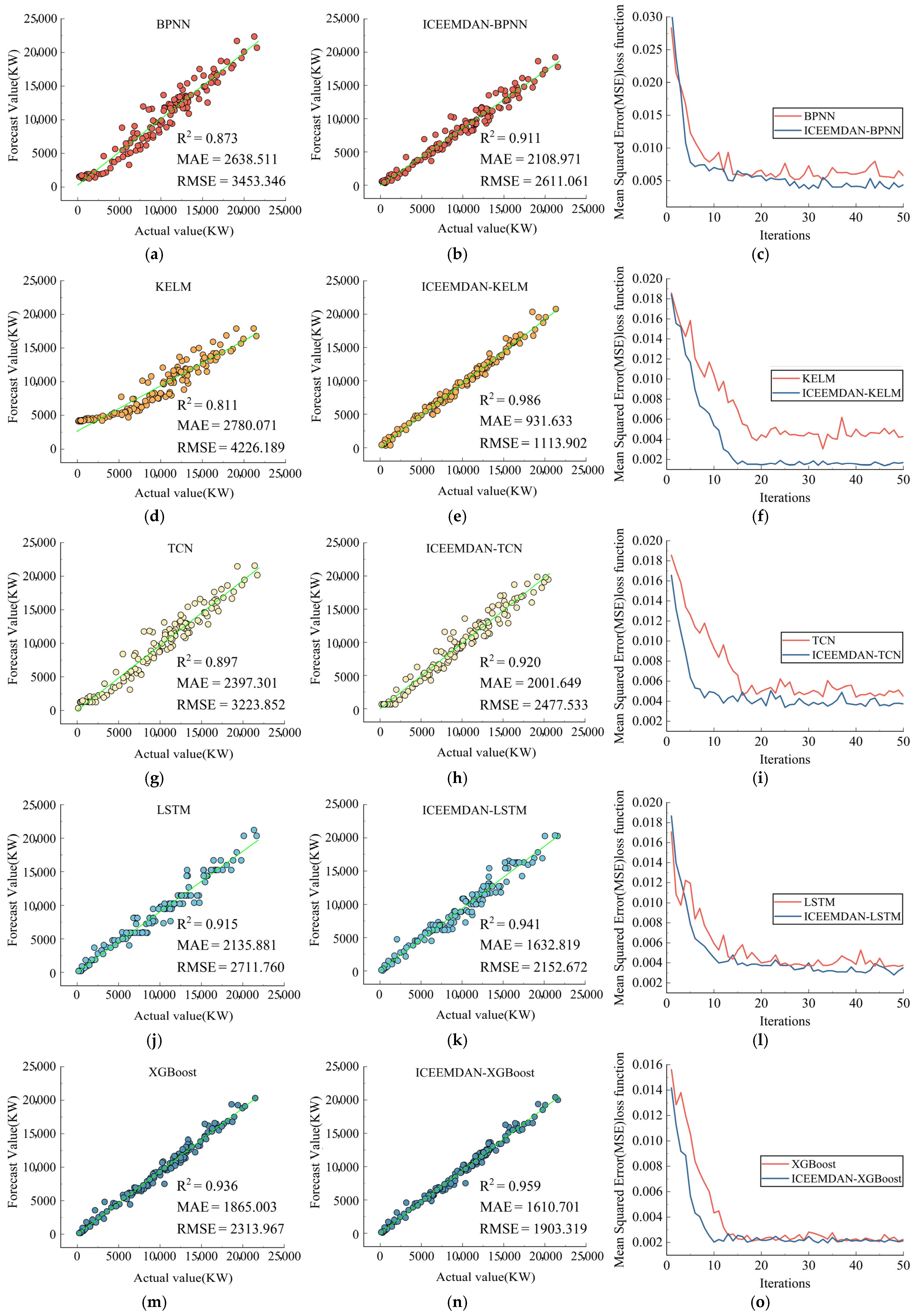 To further validate the effectiveness of the data preprocessing method, six different machine learning and deep learning prediction models (Back Propagation Neural Network (BPNN), Kernel-based Extreme Learning Machine (KELM), TCN, LSTM, eXtreme Gradient Boosting (XGBoost), and Transformer) were selected for a comparative experiment, as shown in