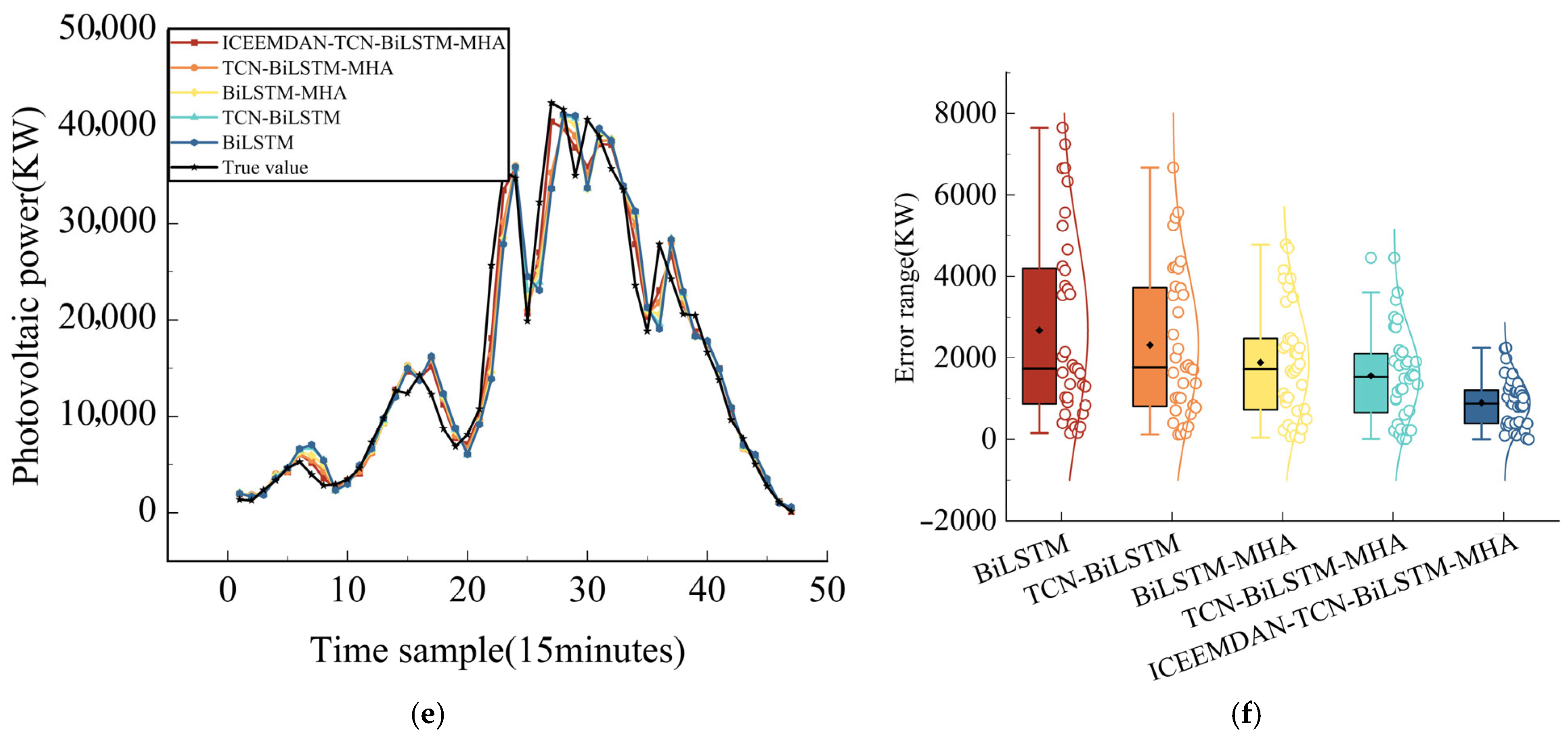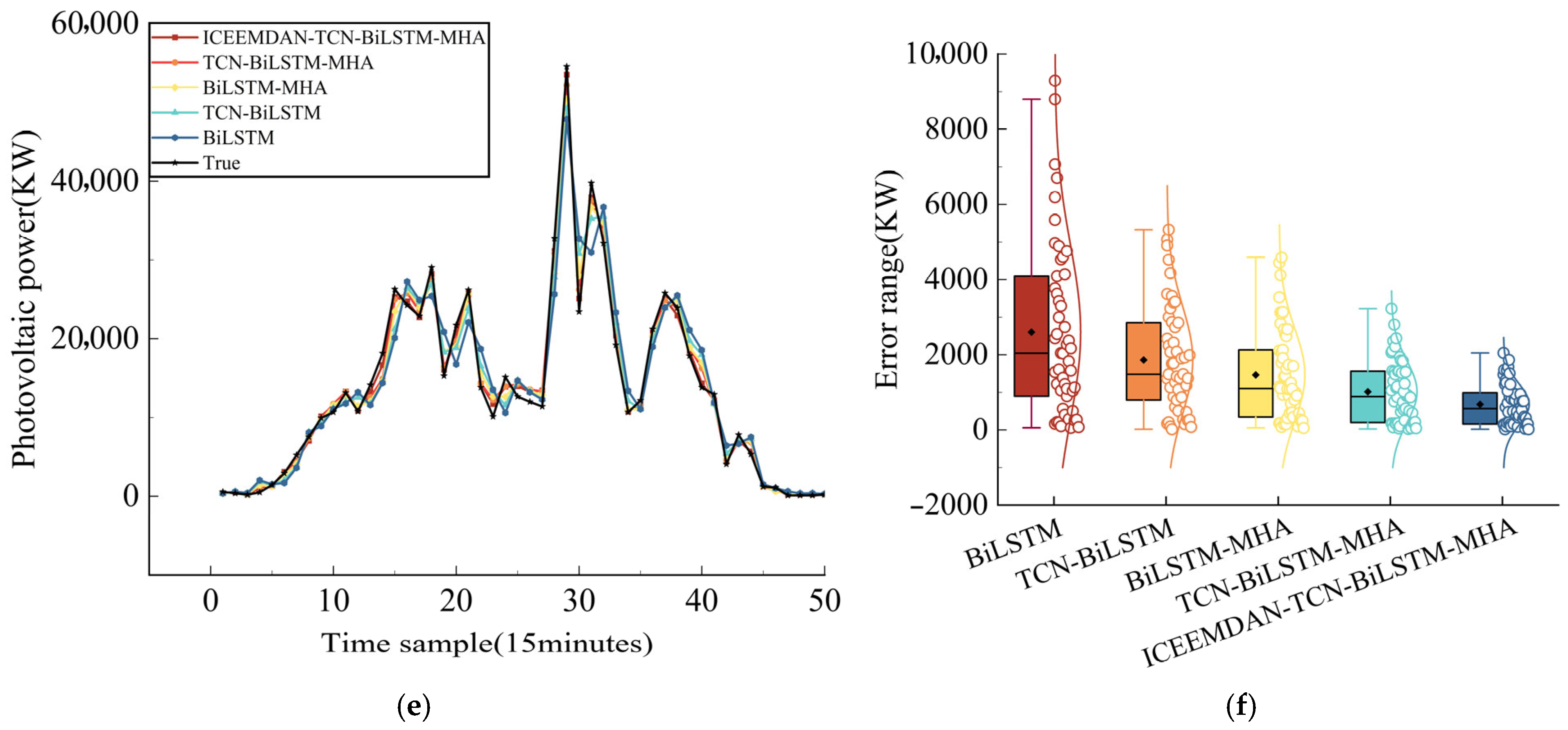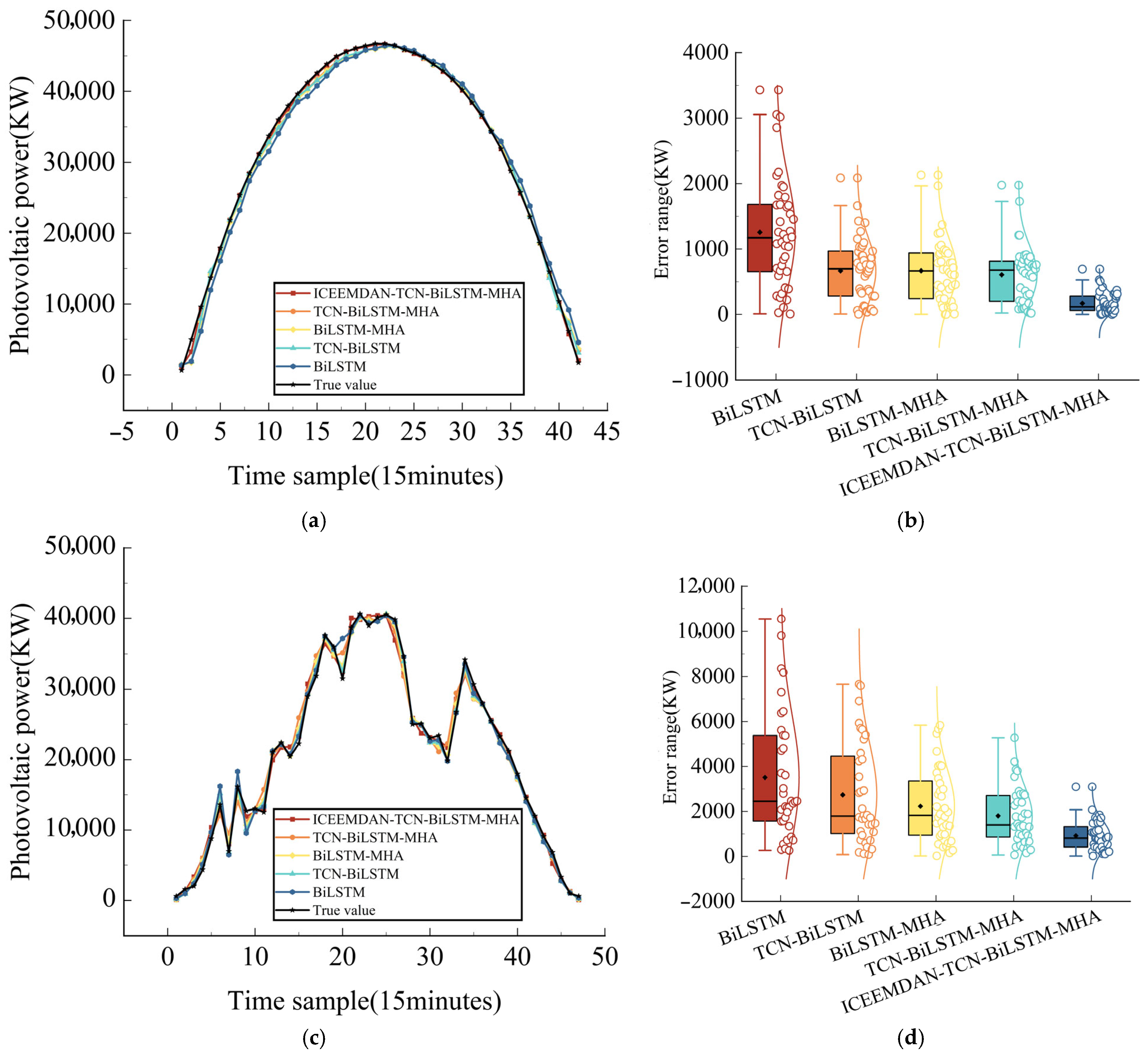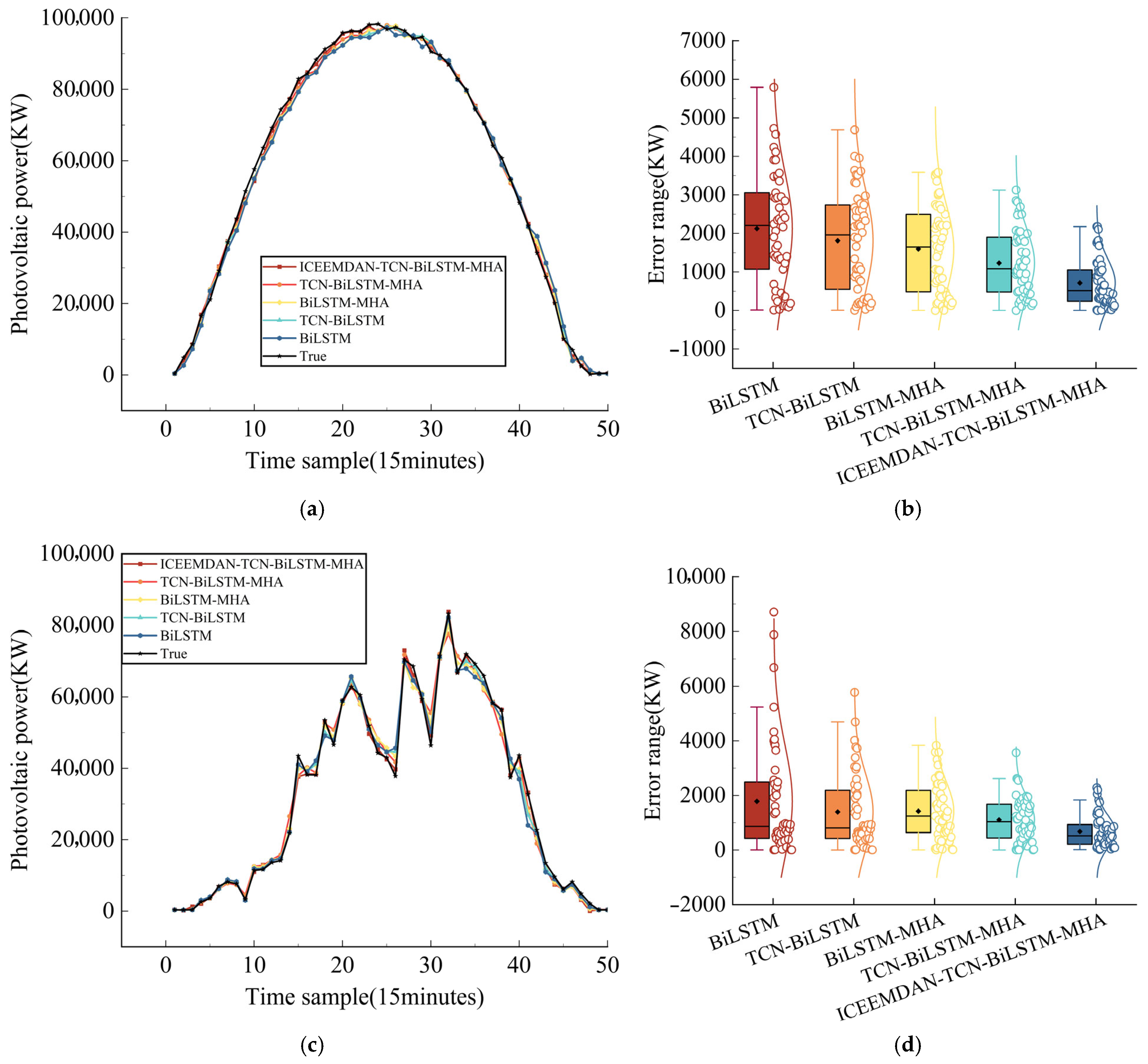 2 0.98). Among them, the ICEEMDAN-TCN-BiLSTM-MHA model demonstrated a significant advantage with a MAPE of 2.891%, significantly outperforming other comparison models and single models (BiLSTM model MAPE: 13.429%, TCN-BiLSTM model MAPE: 8.850%, BiLSTM-MHA model MAPE: 7.757%, TCN-BiLSTM-MHA model MAPE: 8.324%). In cloudy scenes, the predictive performance of different models showed significant differentiation. The combined models generally performed better, with the BiLSTM-MHA and TCN-BiLSTM-MHA models achieving MAPE values of 13.49% and 7.00%, respectively, and RMSE values of 2741.33 and 1367.42, respectively. In contrast, the ICEEMDAN-TCN-BiLSTM-MHA model achieved more accurate PV power output prediction results. In rainy weather scenarios, model performance showed significant differences due to fluctuations in irradiance. Among them, the ICEEMDAN-TCN-BiLSTM-MHA combination model outperformed other comparison models in terms of prediction accuracy, with MAPE reduced by 36.27% and 26.34% compared to the BiLSTM-MHA and TCN-BiLSTM-MHA models, respectively. The BiLSTM and TCN-BiLSTM models exhibit more pronounced errors in this scenario, with MAPE values reaching 2.41 times and 2.11 times that of ICEEMDAN-TCN-BiLSTM-MHA, respectively.