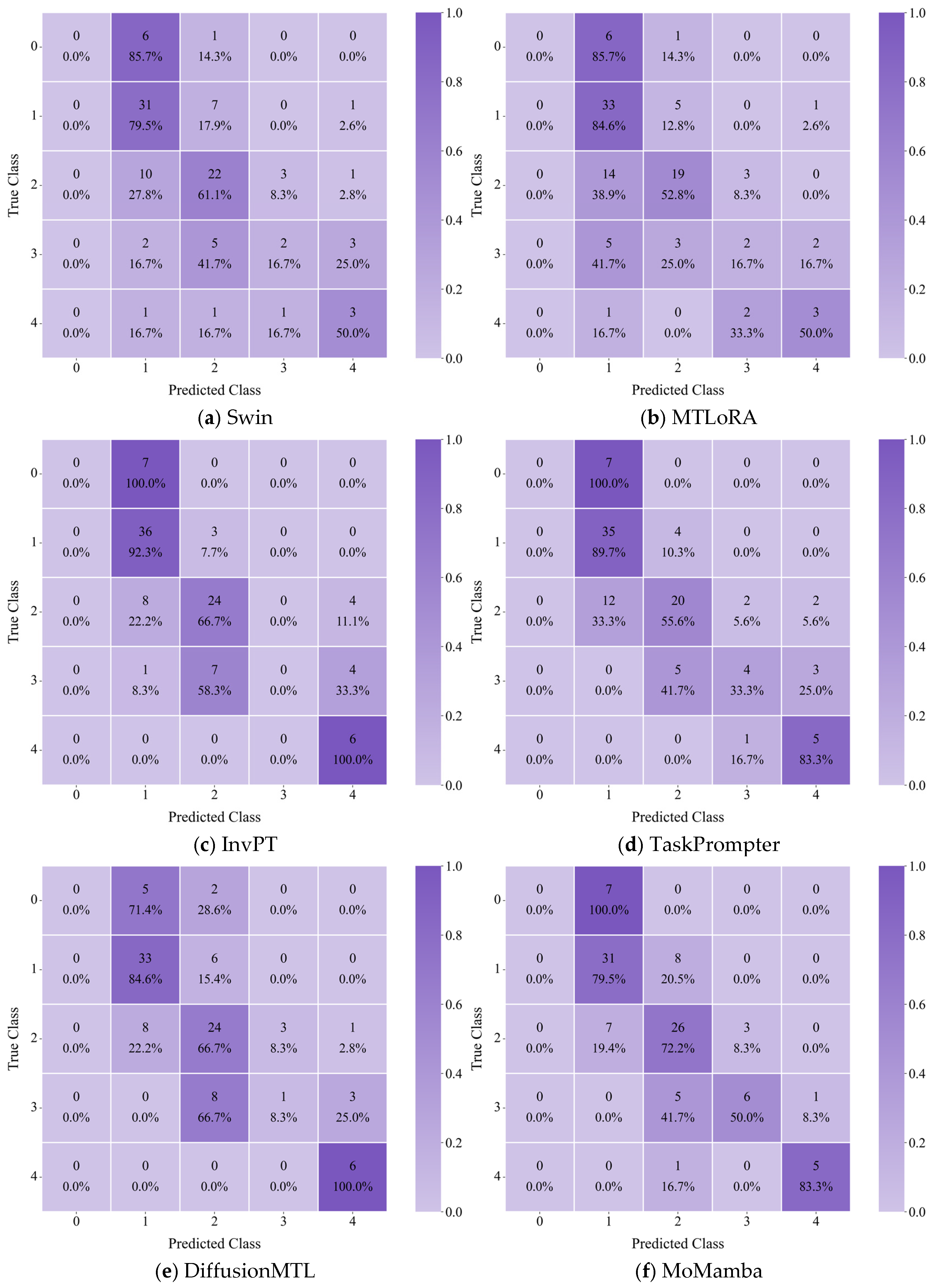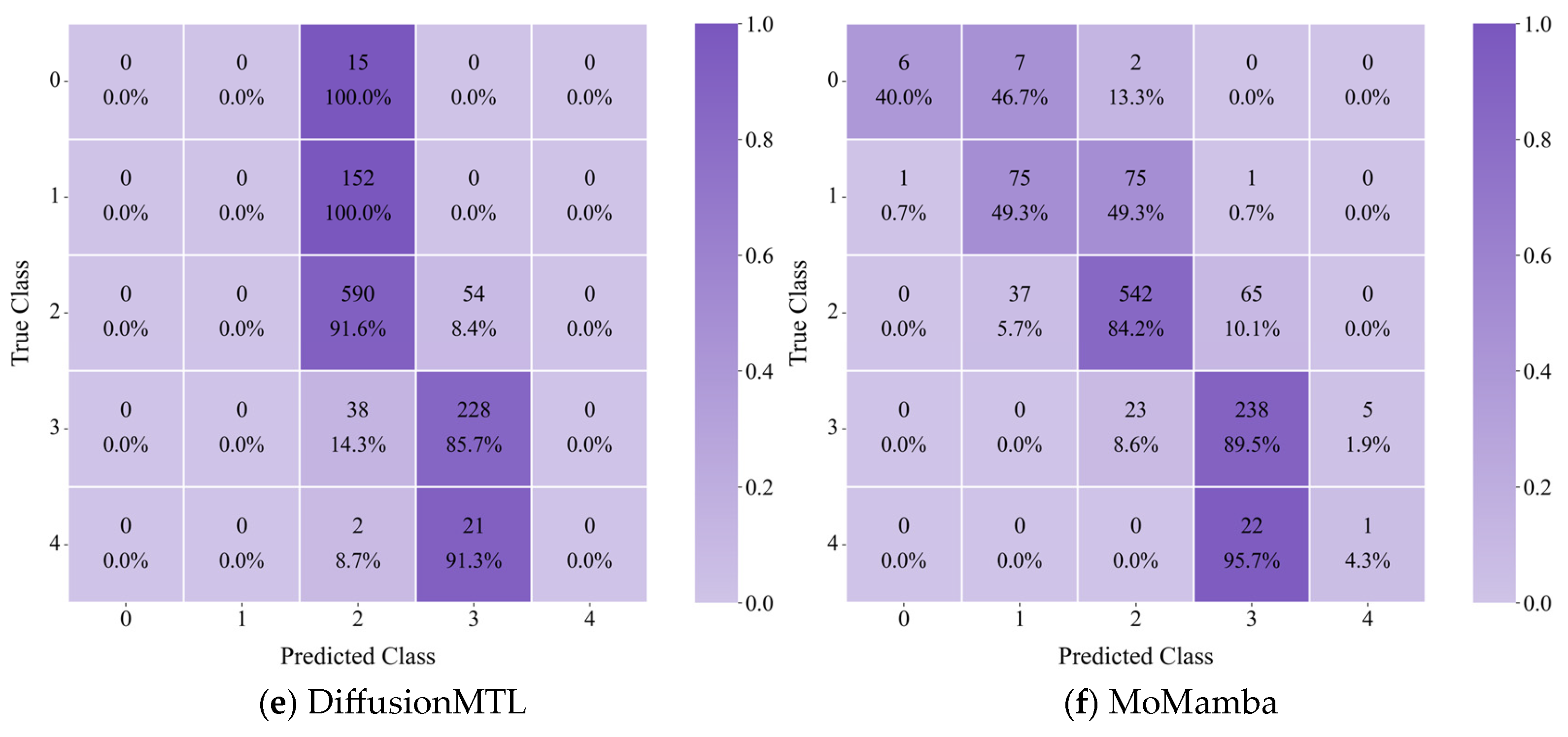 Figure 11f, MoMamba exhibits superior performance in recognizing all categories, effectively addressing both dominant and minority classes. The model achieves prediction ACCs of 40.0%, 49.3%, 84.2%, 89.5%, and 4.3% for classes “0” through “4”, respectively. Notably, despite class “4” representing an extremely rare category, the model maintains meaningful recognition capability, demonstrating its inherent robustness and class awareness.