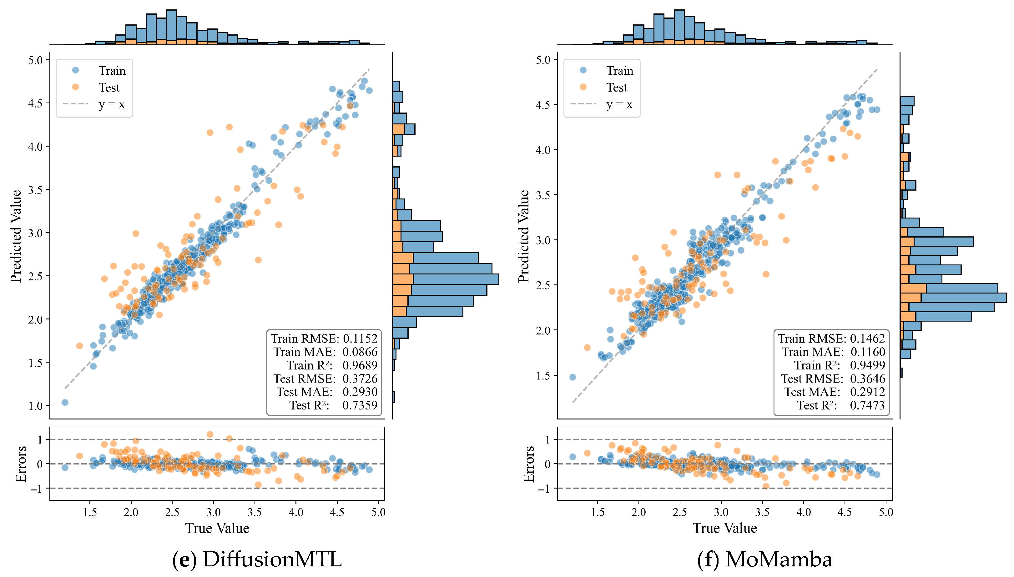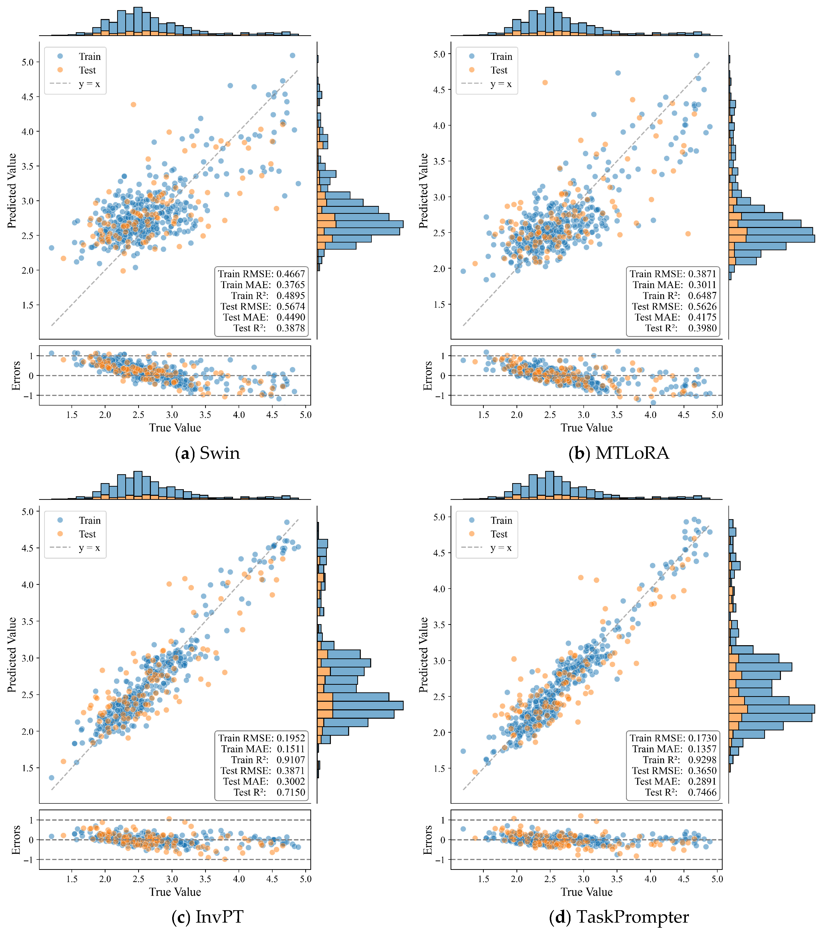 Figure 10f illustrates that our model achieves a tight clustering of predictions along the ideal line, and the marginal histograms of the training and test sets are highly consistent, indicating strong generalization capability. Residuals are concentrated near zero, particularly within the range of 3.5–4.0, where prediction errors are minimal. Our proposed model achieves RMSE values of 0.1462 and 0.3646 on the training and test sets, respectively, resulting in a difference of 0.2184. By comparison, TaskPrompter [