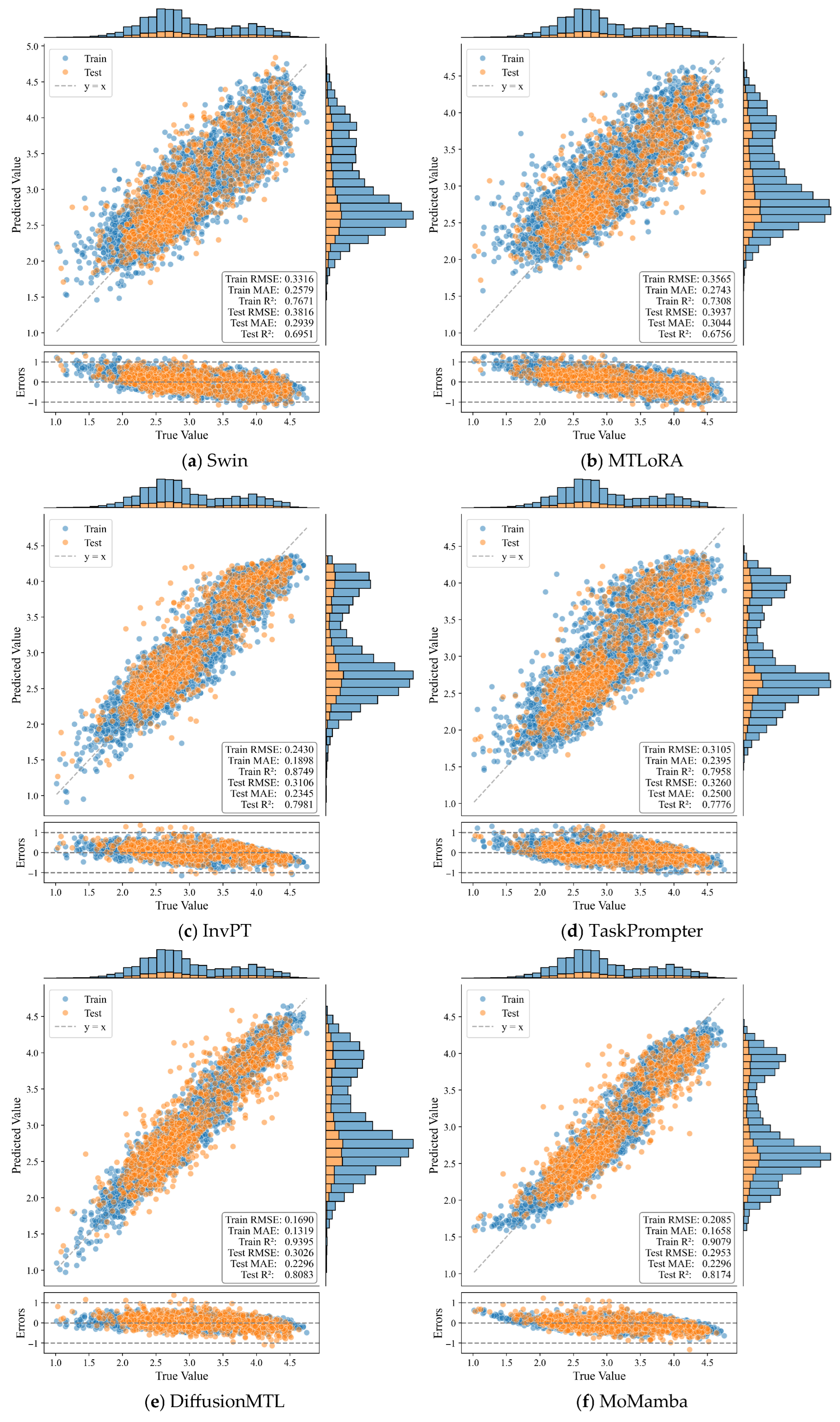 55], and MoMamba. Each subfigure displays predicted versus true values, along with marginal histograms and residual error distributions. Blue and orange points represent training and test samples, respectively.