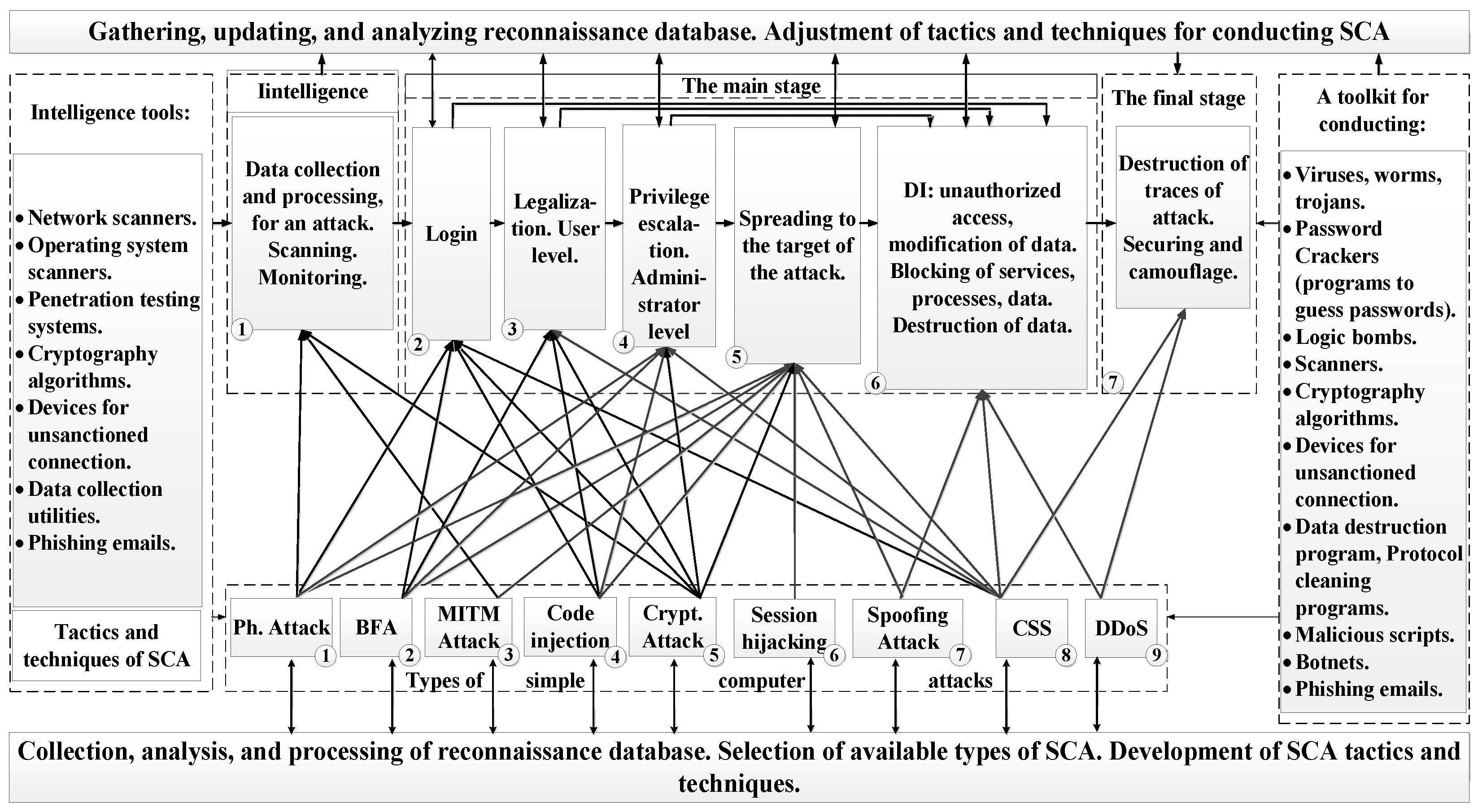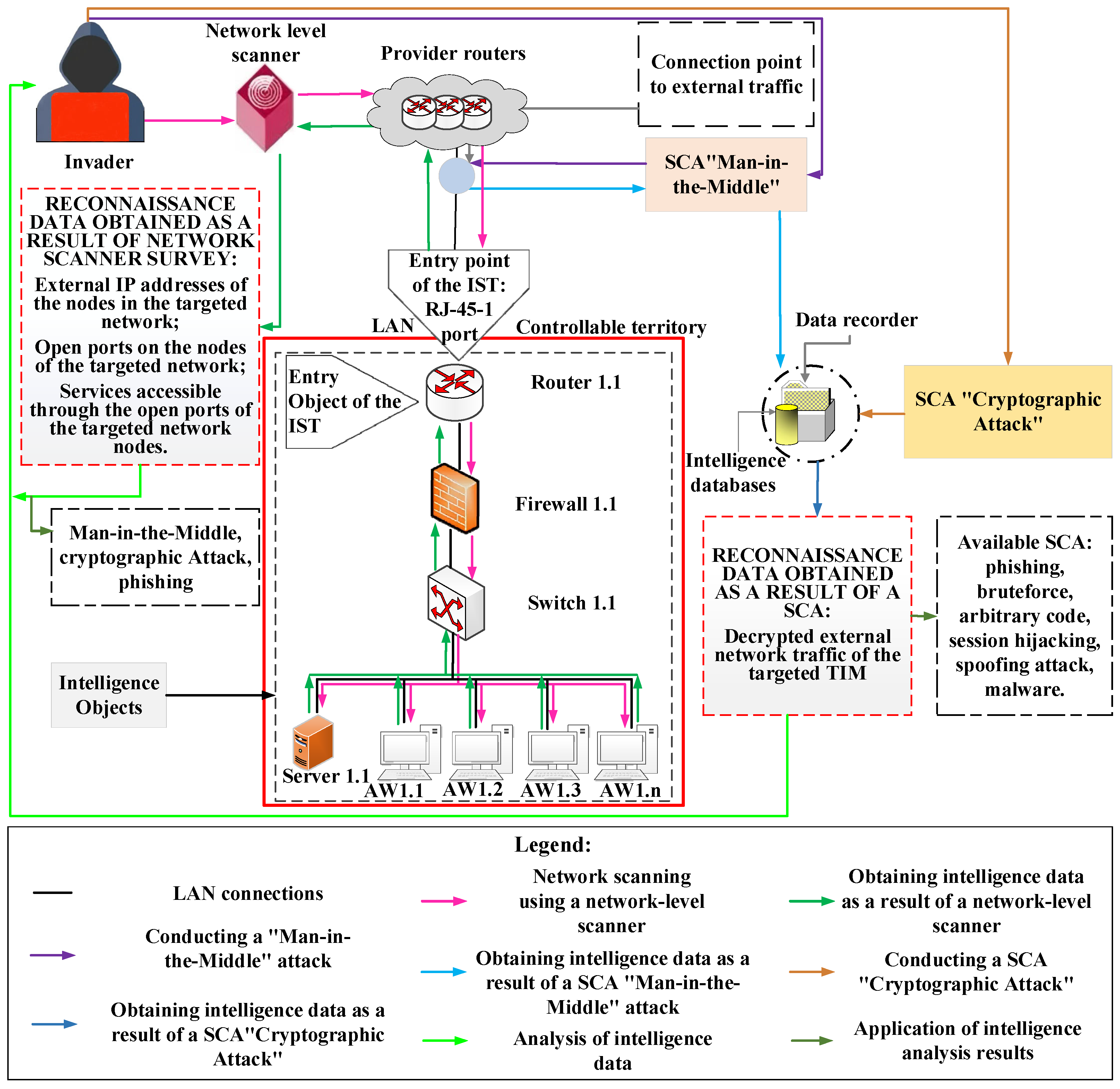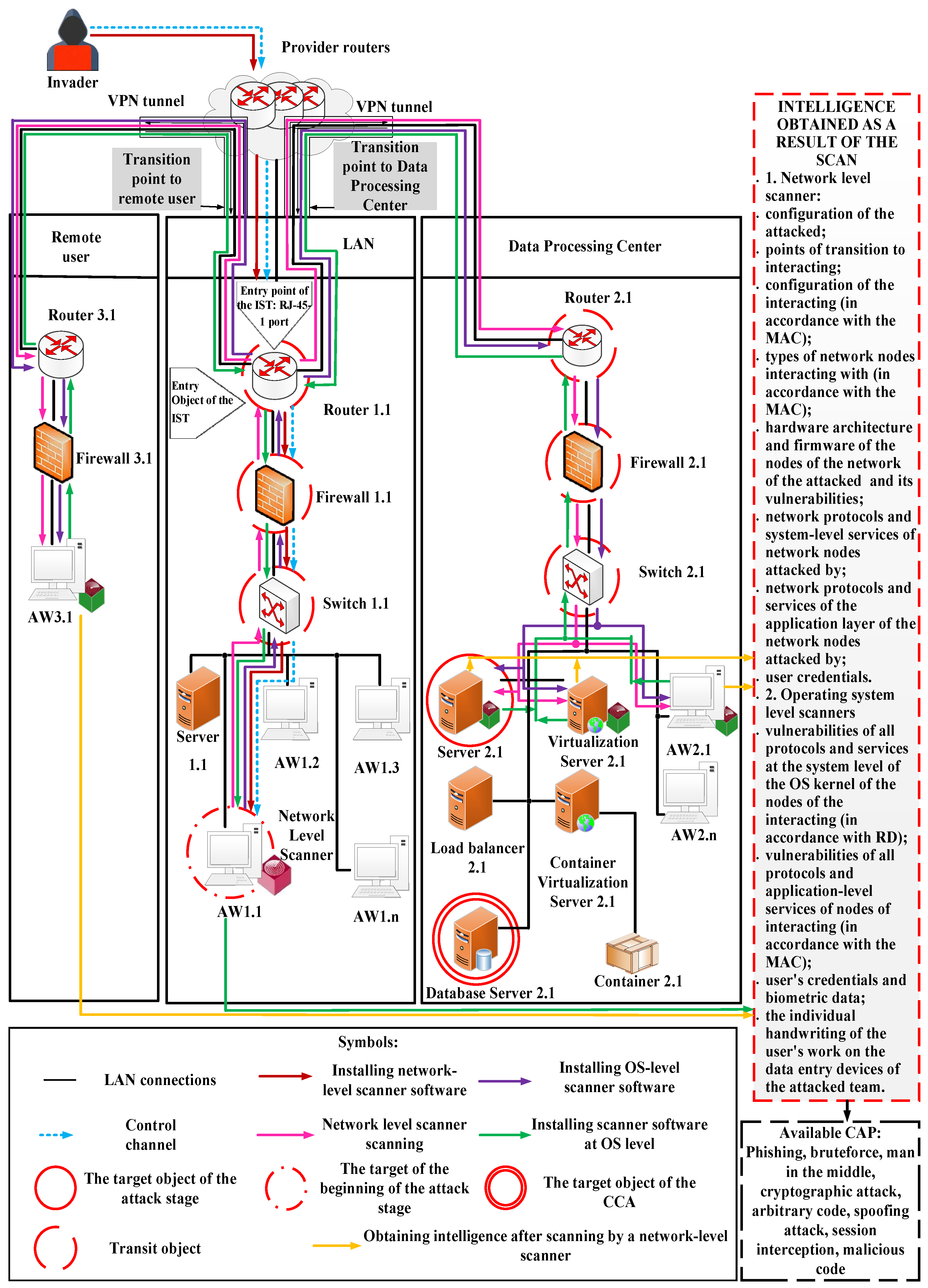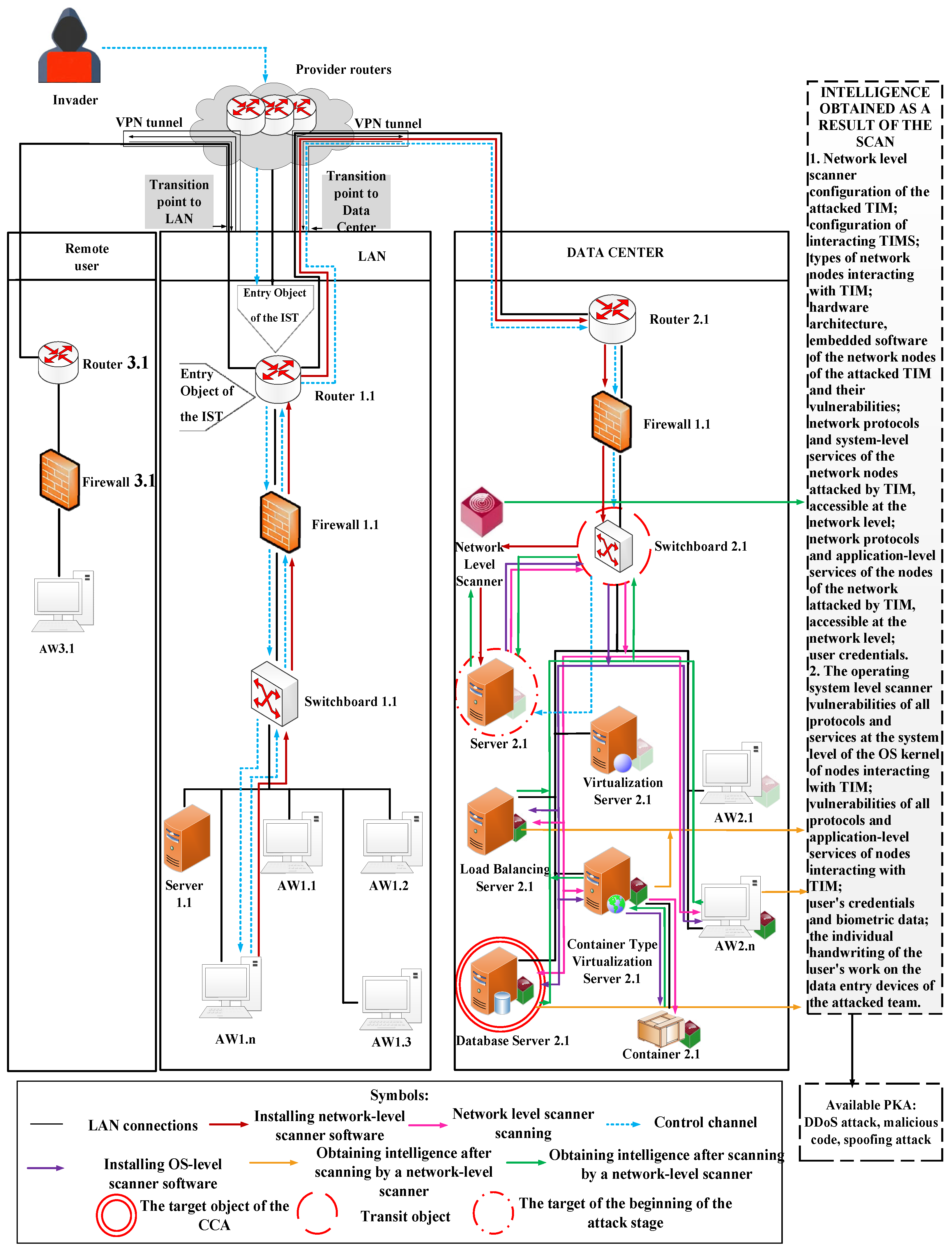 Configuration of available NN; entry and transition points on accessible NN; types of available NN; all IP addresses; open ports; encrypted external traffic. | Types and specification of hardware architecture, embedded SW of NN and their vulnerabilities. | OS types and specification; vulnerabilities and types of all network protocols and control systems (CSs); ACM; file systems; drivers; process management subsystems. | Types and specification of ASW; all network protocols and application layer services; vulnerabilities in application-level protocols and services. | Types and specification of user-level devices and their vulnerabilities; credentials and biometric data of users of the NN; the individual handwriting of the users of the NN. | ||