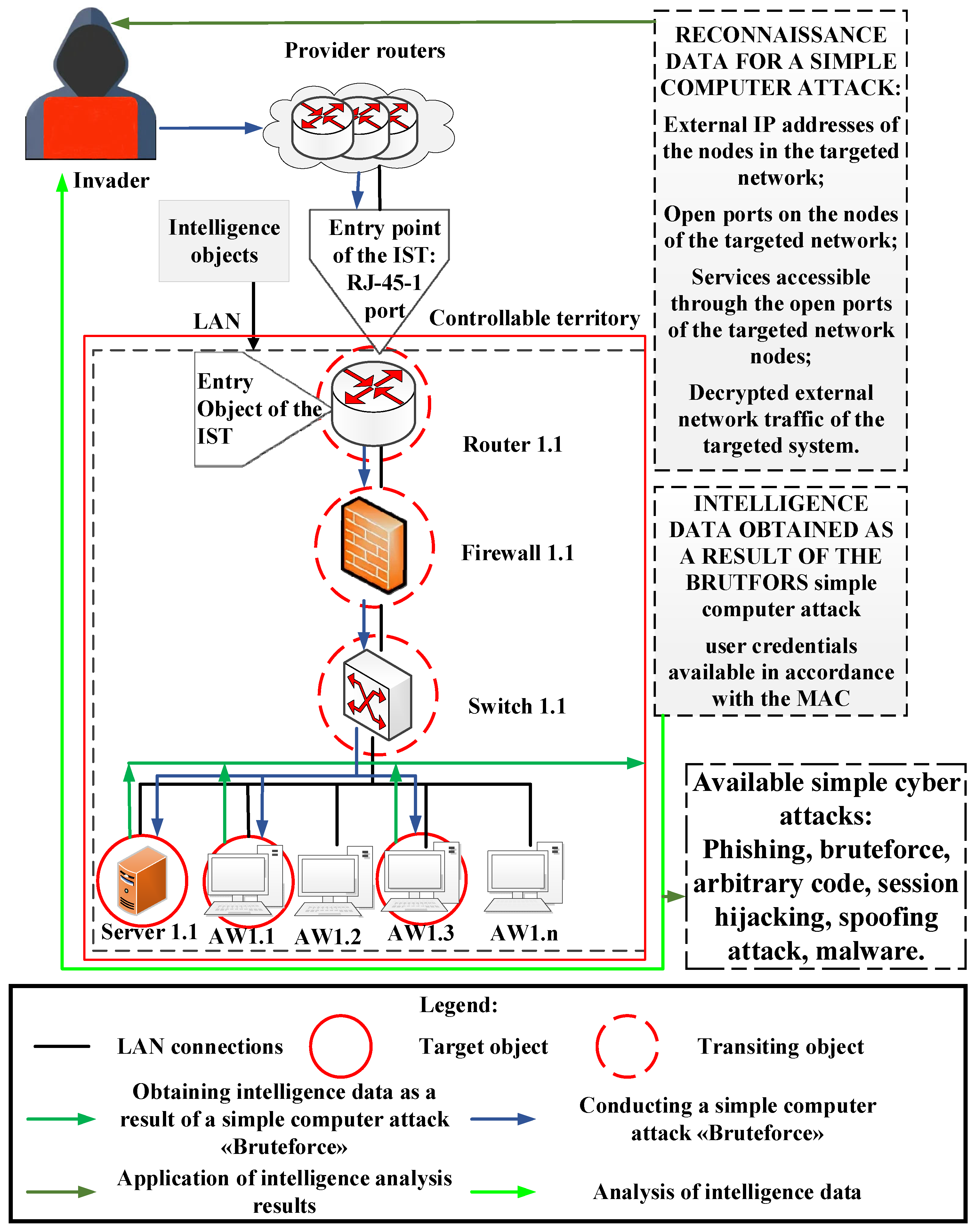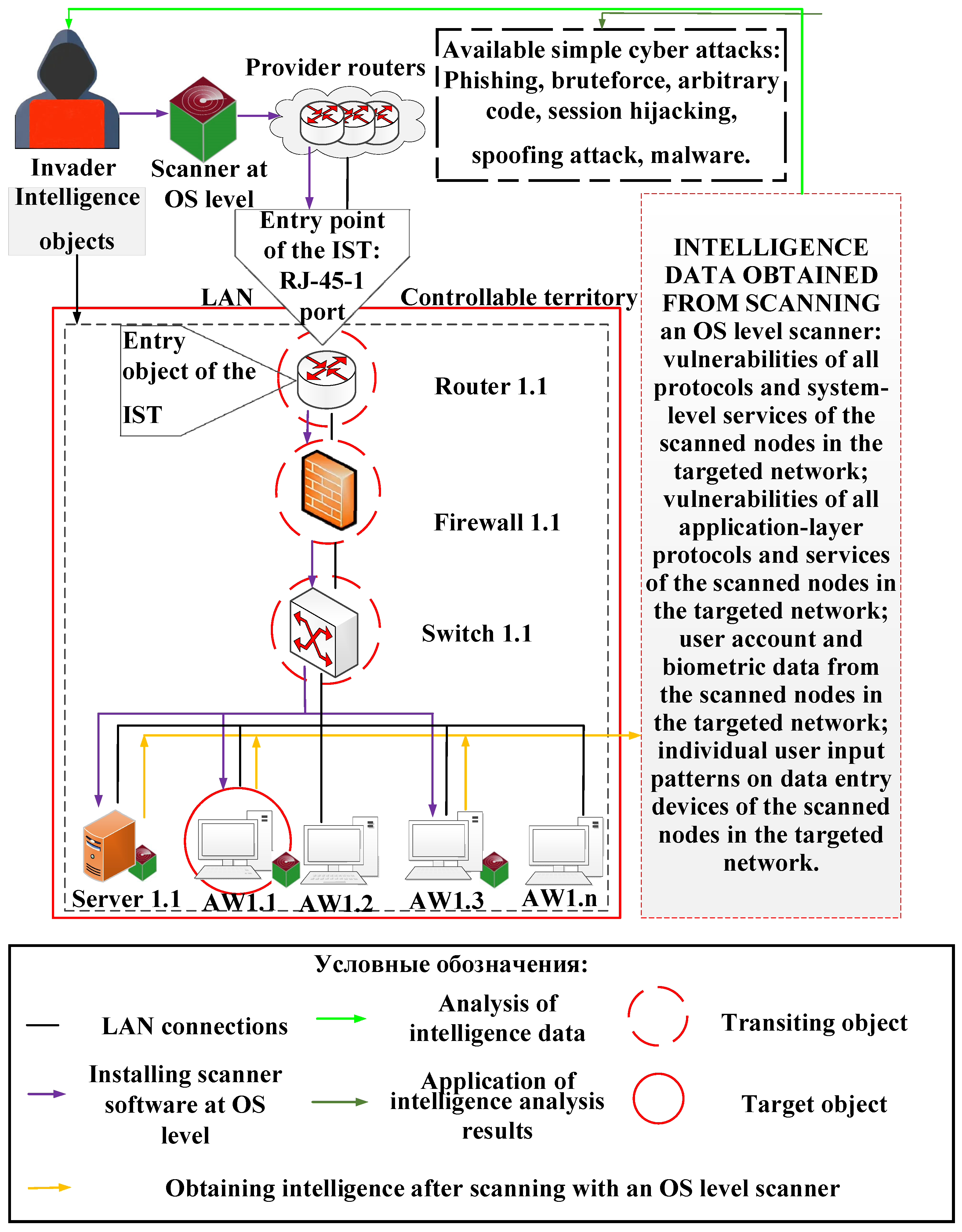Privilege escalation, penetration, legalization, ID gathering | Medium | View of a network node of a DIS element; IP addresses; open ports; encrypted external traffic. | Types and specification of hard ware architecture, embedded SW of NN and their vulnerabilities. | OS types and specification; vulnerabilities and types of all network protocols and control systems (CSs); ACM; file systems; drivers; process management subsystems. | Types and specification of ASW; all network protocols and application layer services; vulnerabilities in application-level protocols and services. | Types and specification of user-level devices and their vulnerabilities; credentials and biometric data of users of the NN; the individual handwriting of the users of the NN. |