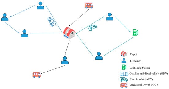 In recent years, the hybrid scheduling of electric and fuel-powered refrigerated vehicles has become an emission reduction hotspot. Song et al. [20] validated the environmental advantages of electric models for short-distance delivery through urban–rural customer distribution experiments. However, existing research still exhibits significant limitations: most models oversimplify charging facility availability and charging time constraints, while failing to adequately integrate social transportation resources to address last-mile delivery volatility.