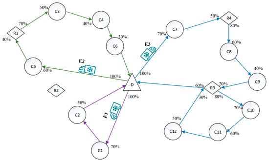 Figure 2 illustrates this with 12 customers (C1–C12), 4 stations (R1–R4), and a depot (D). E1 serves C1 and C2 without charging. E2, after delivering to C5, charges at R1 to the required level for serving C3, C4, and C6. E3 charges once at R4 and twice at R3, demonstrating that stations can be used multiple times. R2 is available but is not used in the depicted solution. Battery charge percentages along routes indicate state upon arrival/departure.