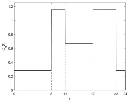 This paper uses time-of-use electricity pricing data from policies issued by China’s Jiangsu Provincial Development and Reform Commission in 2023 [43]. Equation (1) and Figure 3 show the relationship between EV charging prices and time periods, where is the charging price at time t (the unit is CNY/kWh).