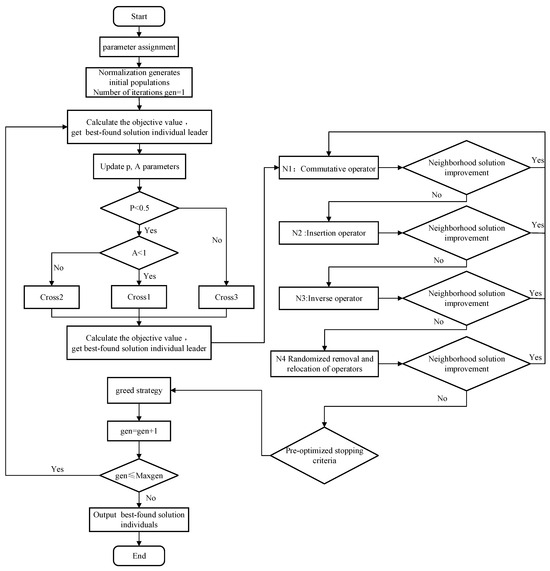 The computational complexity of the IWOA is governed by three main components: population initialization, the main iterative loop including position updates, and the adaptive VNS procedure. This structure ensures effective navigation of the complex solution space inherent in the underlying rich VRP—which incorporates time-of-use electricity pricing, perishability, and crowd-shipping, and is strongly NP-hard. The IWOA achieves a superior balance between exploration (via encircling and random search mechanisms) and exploitation (through bubble-net attack behavior and VNS), reducing premature convergence and improving solution quality compared to algorithms that emphasize one search aspect over the other. The analytical procedure of the IWOA is illustrated in Figure 4.