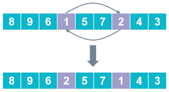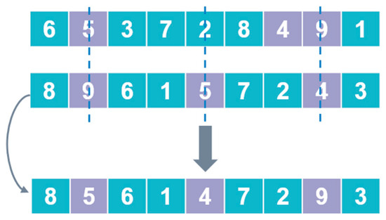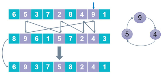 Step 1: First, randomly select an element at a position in the individual whale (element 9 at position 8), secondly, find the element (element 4) at the position in the individual whale , then go back to the individual whale to find the position of the element (element 4 at position 7), and then find the element (element 2) at the position in the individual whale . Repeat the previous work until a loop is formed (Figure 5 right diagram), the positions of all the elements in the loop are the final selected positions (positions 2, 5, 7, and 8).