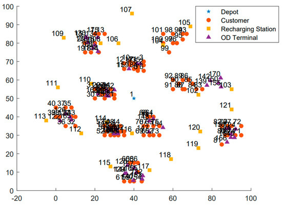 First, a random sequence generates the initial population. After that, the location coding of the whales is repaired: (1) Ensure that the first node in the coding is a vehicle node: if the first node in the location coding is not a vehicle node, swap the first node with the first vehicle node in the coding; (2) Ensure that every vehicle satisfies the capacity constraints: for each vehicle exceeding the capacity constraints, attempt to move the node with the smallest demand in its route to the route of another vehicle that still has available capacity; and (3) OD detour repair: randomly select the demand points of ODs that do not satisfy the constraint and insert them into the routes of other non-ODs. Then, check whether there is a customer that does not satisfy the power constraint, and if so, insert the nearest charging station to the previous customer into the distribution route.