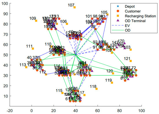 First, the significant cost reduction (averaging 24.94% across all tested instances) achieved by the joint distribution model with ODs’ participation demonstrates the practical value of integrating crowd-shipping resources into cold-chain logistics. This result substantiates that the initial finding of 21.24% cost saving in the C101-100 case is not an outlier but reflects the consistent effectiveness of our approach across diverse customer distribution patterns (clustered, random, and mixed). The cost efficiency primarily stems from two factors: (1) the replacement of high-cost professional vehicles with more economical ODs for certain delivery tasks, and (2) the improved vehicle utilization rates through optimal resource allocation. The complete replacement of GDVs by EVs and ODs in the C101-100 case further confirms the environmental and economic benefits of our approach.