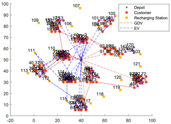 (1) EVs have a limited range, whereas GDVs have a larger range, which is considered sufficient to fulfill the distribution tasks during the planning period;