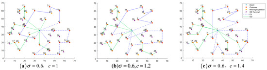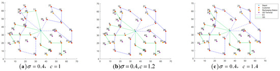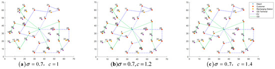When the ODs’ detour factor is held constant, the total distribution cost generally increases as the unit compensation rate rises—with the exception of the case where . When the crowd-shipping unit compensation rate is fixed, the total cost exhibits fluctuations as changes. Among all the combinations, the value of the combination and is the smallest. These optimal combinations are highlighted in bold in Table 11.