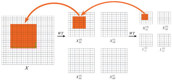 Convolution in the wavelet domain yields an enlarged receptive field. In this example, when applying a 3 × 3 convolution kernel to the low-frequency components () in the second-level wavelet decomposition, this 9-parameter operation effectively processes lower-frequency information corresponding to a 12 × 12 region in the original input space X [9]. Reproduced with permission from Springer Nature Switzerland. License Number: 1564697-1.