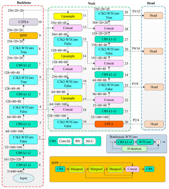 The backbone network includes the standard convolution module (CBS), the C3k2-WTConv module, the spatial pyramid pooling module (SPPF), and the C2PSA module. The CBS module comprises a convolutional layer, batch normalization (BN), and a SiLU activation function, performing downsampling, feature extraction, and processing. The C3k2-WTConv module, an improved version of the original C3k2 combined with wavelet convolution, is a key innovation of this network, and its detailed structure will be elaborated in Section 3.2. The SPPF module, a canonical component in the YOLO series, expands the receptive field through multi-scale pooling, enabling fusion of spatial features across different granularities. The C2PSA module combines the CSP structure with the PSA attention mechanism, enabling efficient feature map processing and enhanced focus on critical regions. The neck network employs a hierarchical FPN + PAN architecture for multi-scale feature fusion, effectively aggregating both high-level semantic and low-level spatial features.