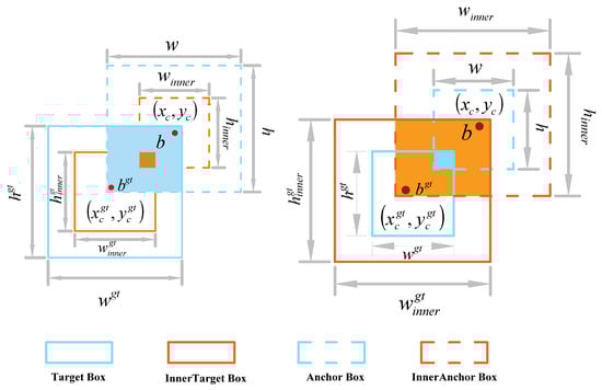 The computational principle of InnerShape-IoU will be explained below with reference to Figure 5, where and b represent the ground-truth box and anchor box, respectively. The center points of both the ground-truth (GT) box and inner GT box are denoted as (), while those of the anchor box and inner anchor box are represented by (). The width and height of the GT box are and , respectively, and the corresponding dimensions of the anchor box are w and ℎ. The scaling factor, denoted as ratio, typically takes values within the range [0.5, 1.5].