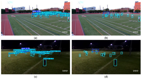 Despite the promising results, this work has several limitations. The most significant limitation is the generalization ability of the model across different soccer datasets. To assess this, we evaluated our model on the Football dataset [48]. We observed a severe performance degradation for all models, including the baselines (e.g., mAP dropping from ~60% to approximately zero). This observation confirms a profound domain shift, likely caused by fundamental differences in the following: (1) Visual characteristics: (e.g., image resolution, lighting conditions, camera angles). (2) Annotation protocols: (e.g., the definition of a ‘player’ bounding box may vary significantly between datasets). This phenomenon underscores a common but critical challenge in sports AI—models trained on one benchmark often fail to generalize to others due to a lack of standardization [49]. Therefore, the performance claims in this study are most accurately interpreted within the context of the Soccer Detection dataset.