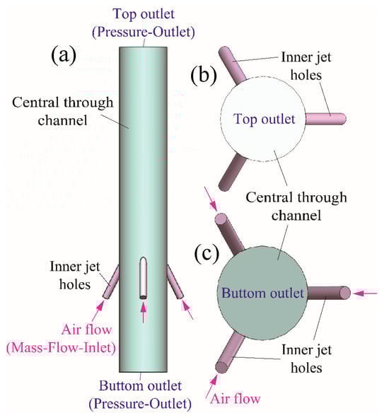 The 3D model schematic diagrams of the flow domain of the three uniformly distributed inner jet holes at the same level (i.e., JB3 model) for CFD simulation: (a) Front view; (b) top view; (c) bottom view.