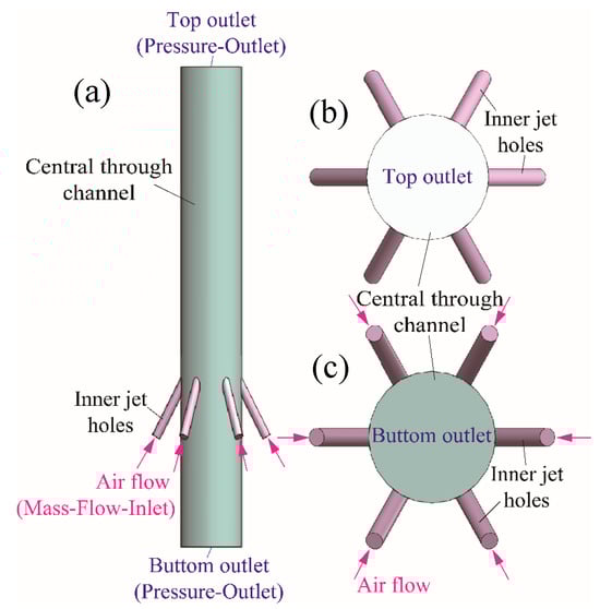 The 3D model schematic diagrams of the flow domain of the six uniformly distributed inner jet holes at the same level (i.e., JB6 model) for CFD simulation: (a) Front view; (b) top view; (c) bottom view.