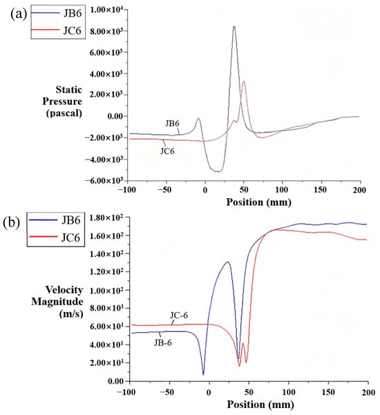 The curve charts of static pressure and velocity magnitude at the central axis of the JB6 and JC6 models: (a) The curve charts of static pressure; (b) the curve charts of velocity magnitude.