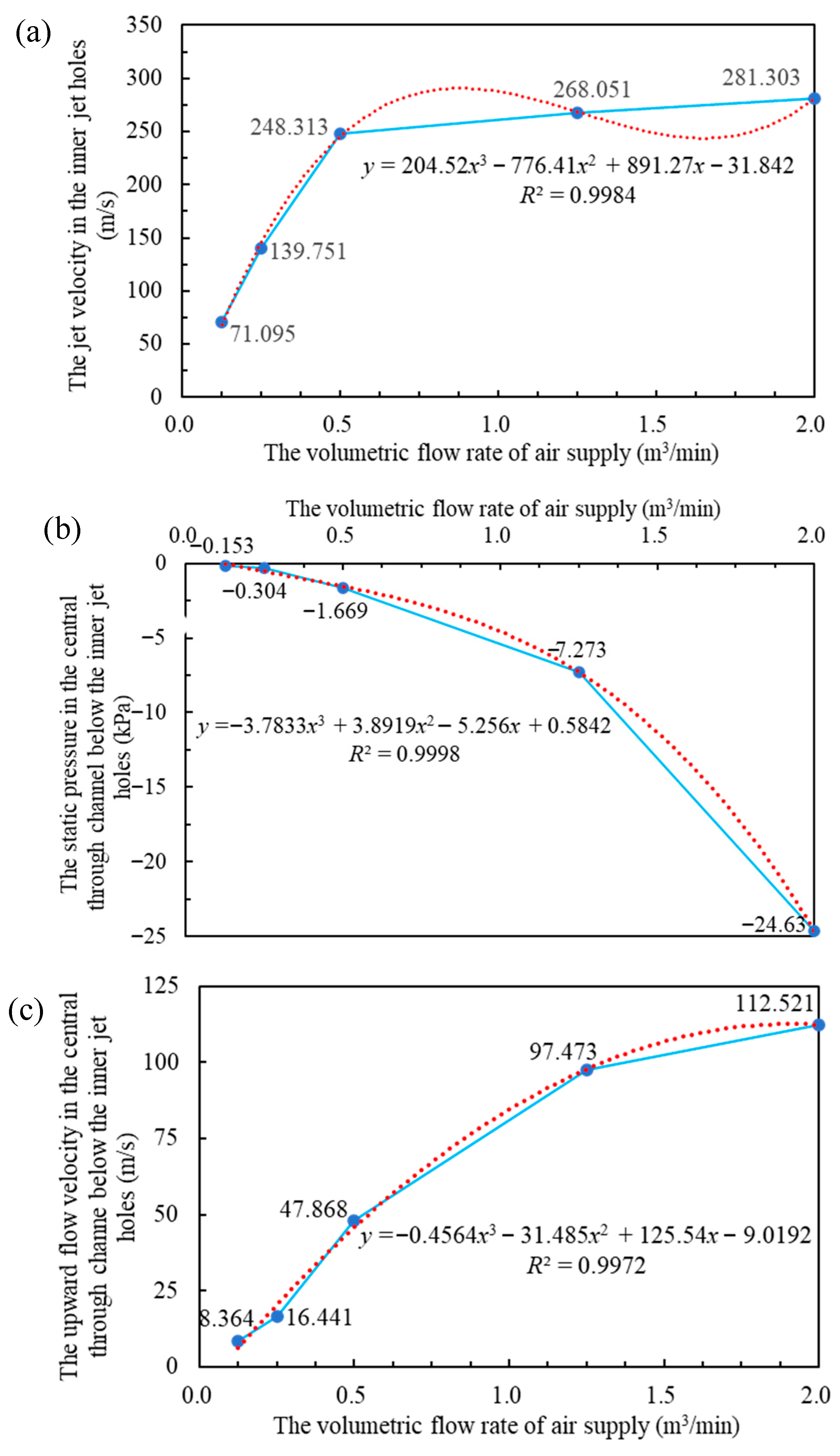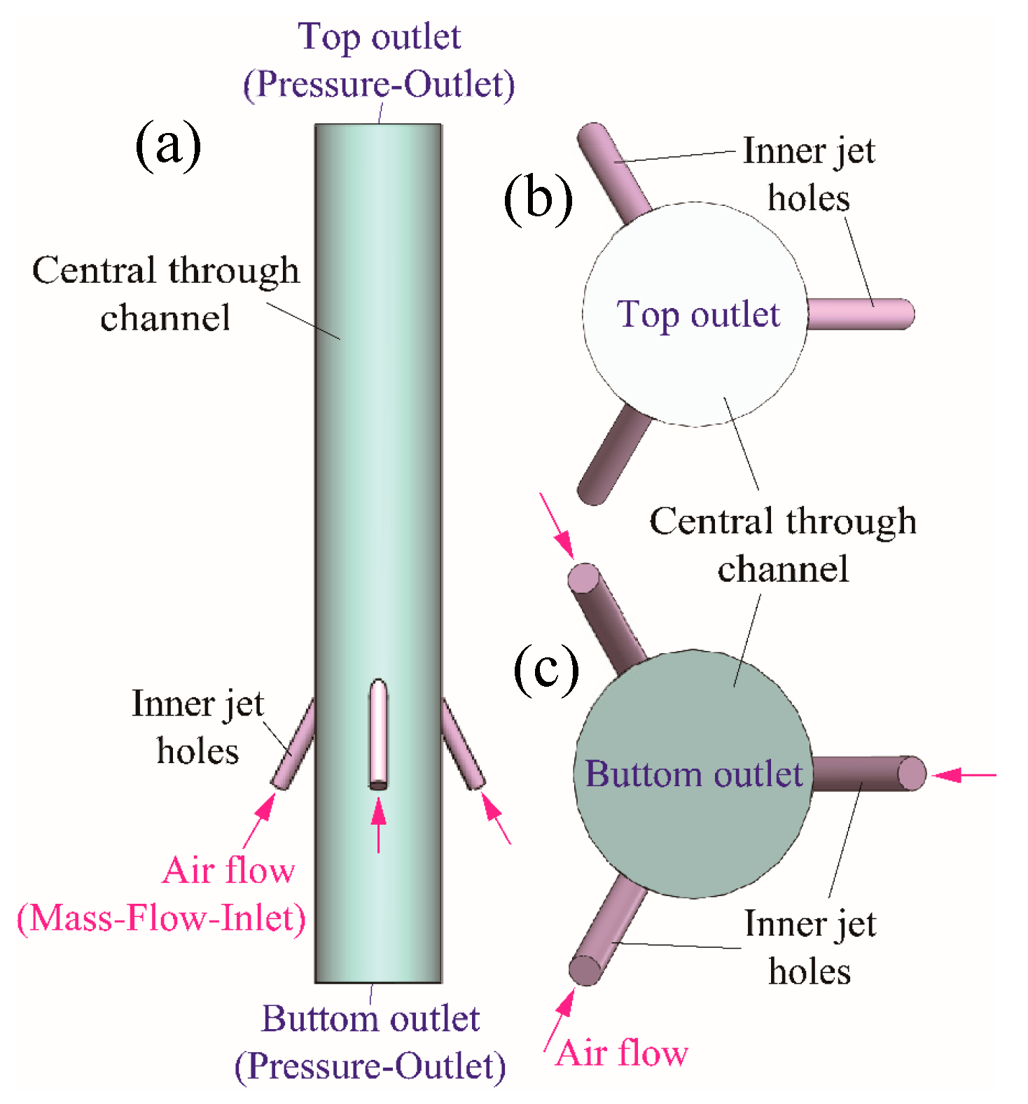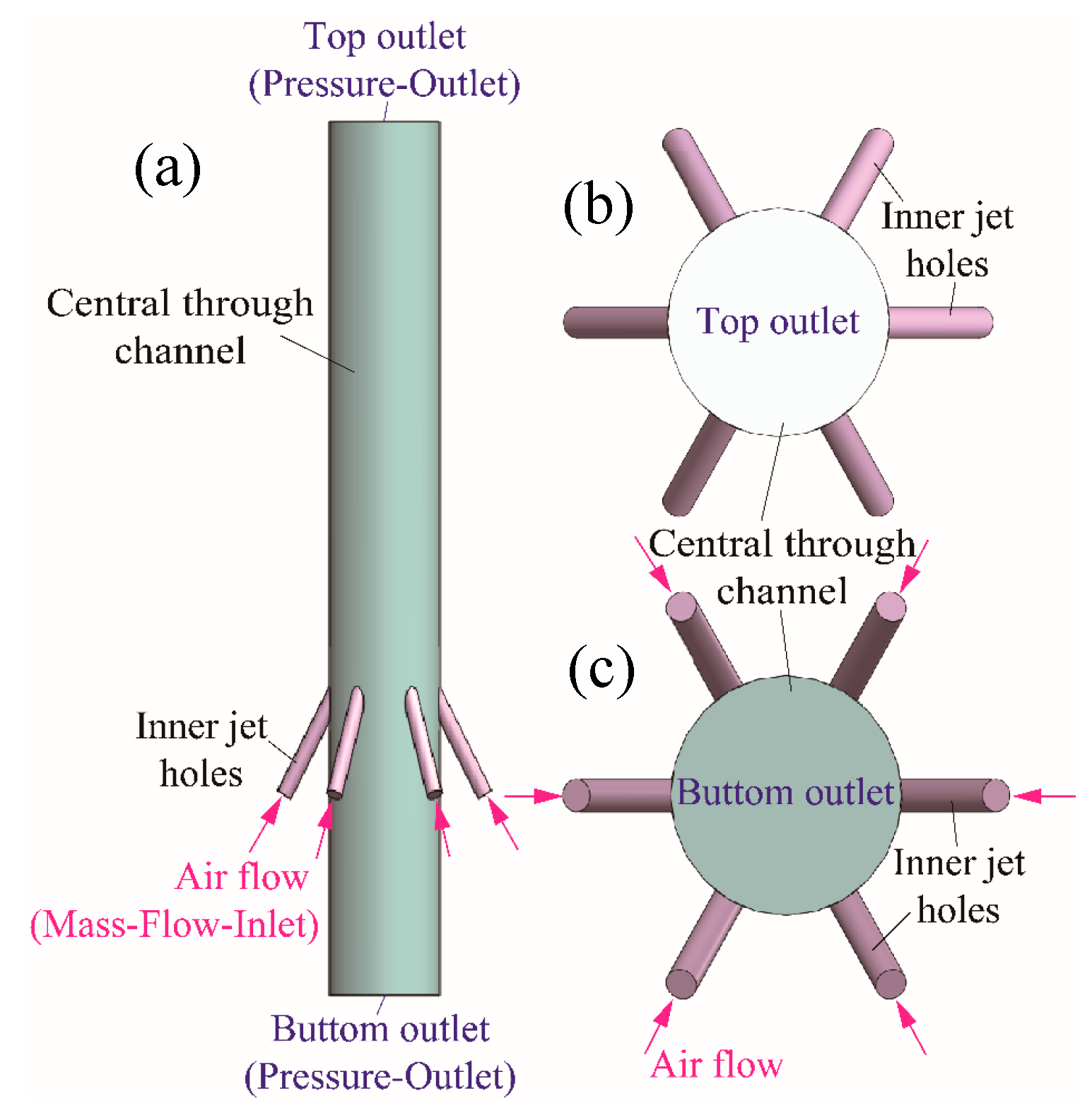 Serial Number | Models of the Local Flow Fields | Volumetric Flow Rate of Air Supply (m3/min) | Jet Velocity in the Inner Jet Holes (m/s) | Static Pressure in the Central Through Channel Below the Inner Jet Holes (kPa) | Upward Flow Velocity in the Central Through Channel Below the Inner Jet Holes (m/s) |