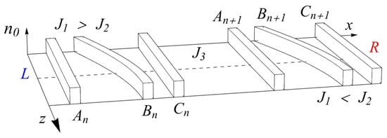 We introduce trimer lattices using their potential experimental implementation in photonics as a basic example [40]; Figure 1 illustrates the concept. Namely, we consider identical single-mode optical waveguides arranged periodically close enough for the tails of their transverse modes to overlap. The overlap allows for the energy exchange, thus coupling the nearest neighbors. The overlap decays exponentially with the distance between waveguides; varying the separation between waveguides allows control of the three coupling parameters , . In particular, the adiabatic modulation of the coupling parameters with the propagation distance z is analogous to the tight-binding model with hopping amplitudes slowly varying over time.