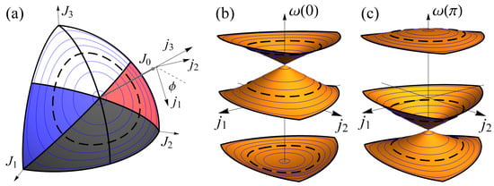 Parameter J can be scaled to 1 by choosing in Equation (1) and transforming and , thus reducing the dimensions of parameter space from 3 to 2. On the sphere , the only parameter that defines the energy in Equation (3) is . Therefore, the dispersion relation does not change if we follow a line on the sphere J. These “dispersionless” trajectories are closed loops around the degeneracy axis (monatomic lattice); several such level contour lines of the surface are drawn on a sphere in Figure 2a. The loops originate from a degeneracy point with a maximal value , and, as , they converge to the boundary of the spherical triangle in Figure 2a, where one or two hopping parameters vanish at the edges or vertices, respectively.