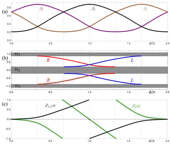 The most revealing topological property is the appearance of edge states in the spectral gaps of insulators [3,4]. Edge modes in Figure 3b bifurcate from bands at specific values of , connected with noncentered inversion symmetries of the lattice [46,47,48,49,50]. The domains of their existence [17] can be summarized as follows: (R) right-edge modes for and (L) left-edge modes for . This definition is sufficient to describe the whole parameter domain in Figure 2a. Indeed, an overlap of both domains, , contains both edge modes, and it is marked white in Figure 2a. If none of the conditions are satisfied, , there are no edge states, and corresponding area in Figure 2a is shaded gray. The red-colored sector () corresponds to a single right-edge state in each spectral gap, while the sector with a single left-edge state, (), is shaded blue.