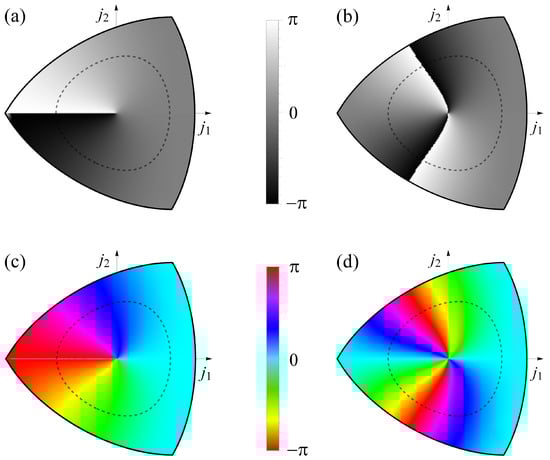 The discontinuities of Zak phases in Figure 3c and Ref. [16] are features known as branch cuts in twisted phases around screw-type wave dislocations [18]; in complex fields phase is quantized by an integer winding number l, often called topological charge. In other words, while the straight path from to in Figure 2b,c involves crossing degeneracy with gap closure, the same phase jump is gained on the path around the degeneracy point. Therefore, we calculate Zak phases in the whole parameter domain; Figure 4 reveals their twists around the degeneracy with well-defined winding numbers, . In contrast to complex fields, e.g., optical vortices [19], there is no singularity at the origin because Zak phases are well-defined zeros along the axis in Figure 4.