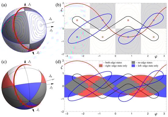Full parameter space on the sphere J (a,c) and corresponding Mercator projection in (b,d) with and spherical azimuth . In (a,b) the white domains of “positive” dislocations , as in Figure 4 with , and the gray domains with “negative” dislocations with and opposite winding numbers, . Positive and negative dislocations are marked in (b,d) by open red and blue circles, respectively. In (c,d) the shading of different domains indicates the number of edge states; see the legend in panel (d) and Figure 2a. The solid red line in all panels, passing through 3 negative dislocations, is the AAH critical trajectory Equation (10) with [14]. Other trajectories indicated in (b,d) with black and blue lines are discussed in the text and Figure 6.